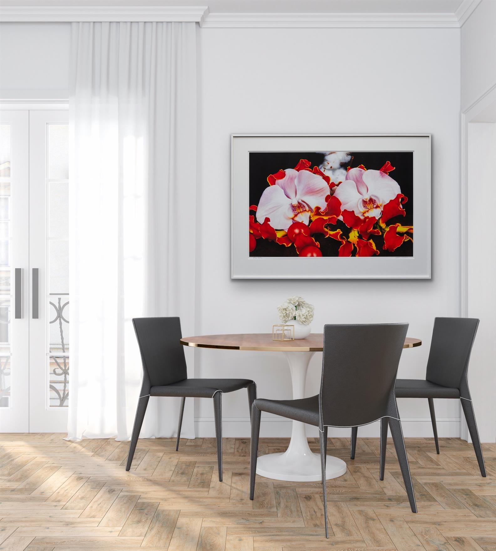 Quinn's 'Flower Series' utilises one of the oldest forms of traditional painting; the still-life. Quinn combines arrangements of flowers and fruit in his studio, bought in London on a particular day, which would often never be found in the natural world together at the same time. In this way the artist shows us how human desire has created new seasons by assembling items together in his studio which nature could not. The arrangements, often set amid a snowy ground or volcanic sand, are then painted in oil by Quinn and these paintings turned into print editions such as the present lot.