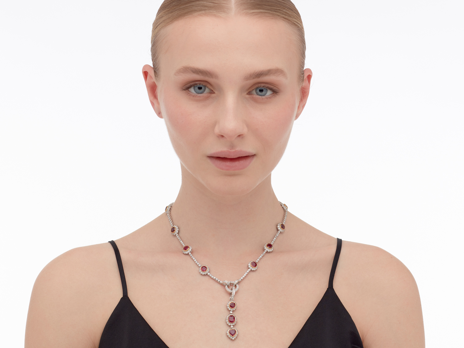 Designed as a continuous row of bezel-set brilliant-cut diamonds, spaced at intervals with mixed-cut ruby and diamond clusters, centring a diamond circlet suspending a detachable ruby and diamond cluster drop, the rubies together weighing approximately 15.15 carats, the diamonds together weighing approximately 7.50 carats, completed by a tongue and groove clasp, pendant length approximately 62mm, necklace length approximately 430mm, gross weight approximately 44.2 grams.