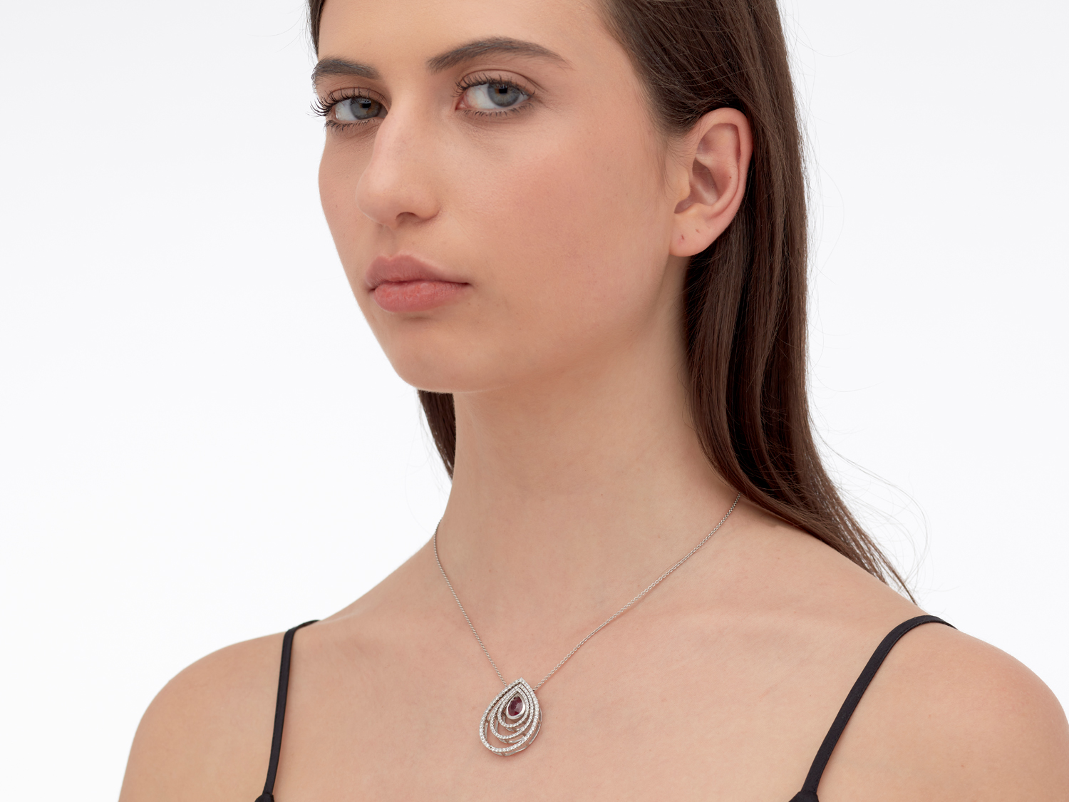 Centring a collet-set oval-cut ruby weighing approximately 1.20 carats, within concentric pear-shaped surrounds set throughout with brilliant-cut diamonds together weighing approximately 0.85 carats, suspended from a fine trace chain completed by a parrot clasp, pendant length 33, necklace length 415mm, gross weight approximately 11.5 grams.