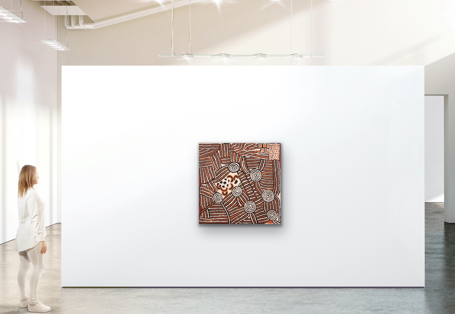 "This painting depicts designs associated with the rockhole and soakage water site of Ngaminya, just to the south-west of the Kiwirrkura Community in Western Australia.