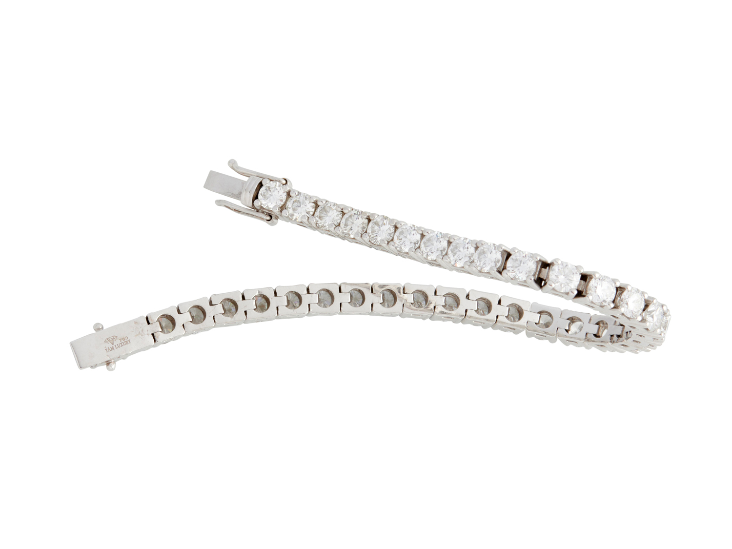 Designed as a continuous line of thirty-four claw-set brilliant-cut diamonds together weighing approximately 11.90 carats, completed by a tongue and groove clasp, length 170mm, gross weight approximately 30.7 grams.
