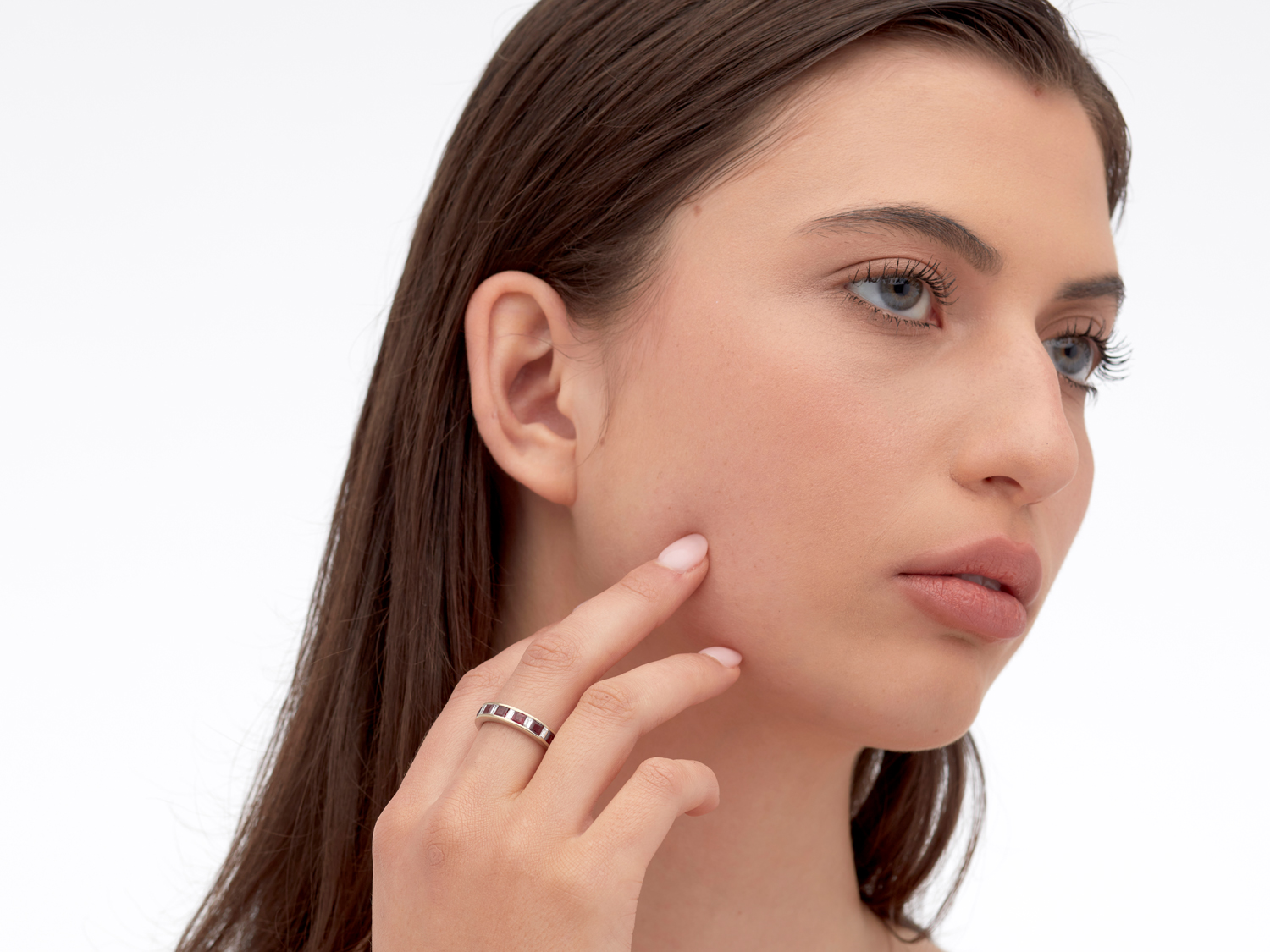 Of full circle design, set with baguette-cut rubies together weighing approximately 1.60 carats, spaced by baguette-cut diamonds together weighing approximately 0.40 carats, size O.