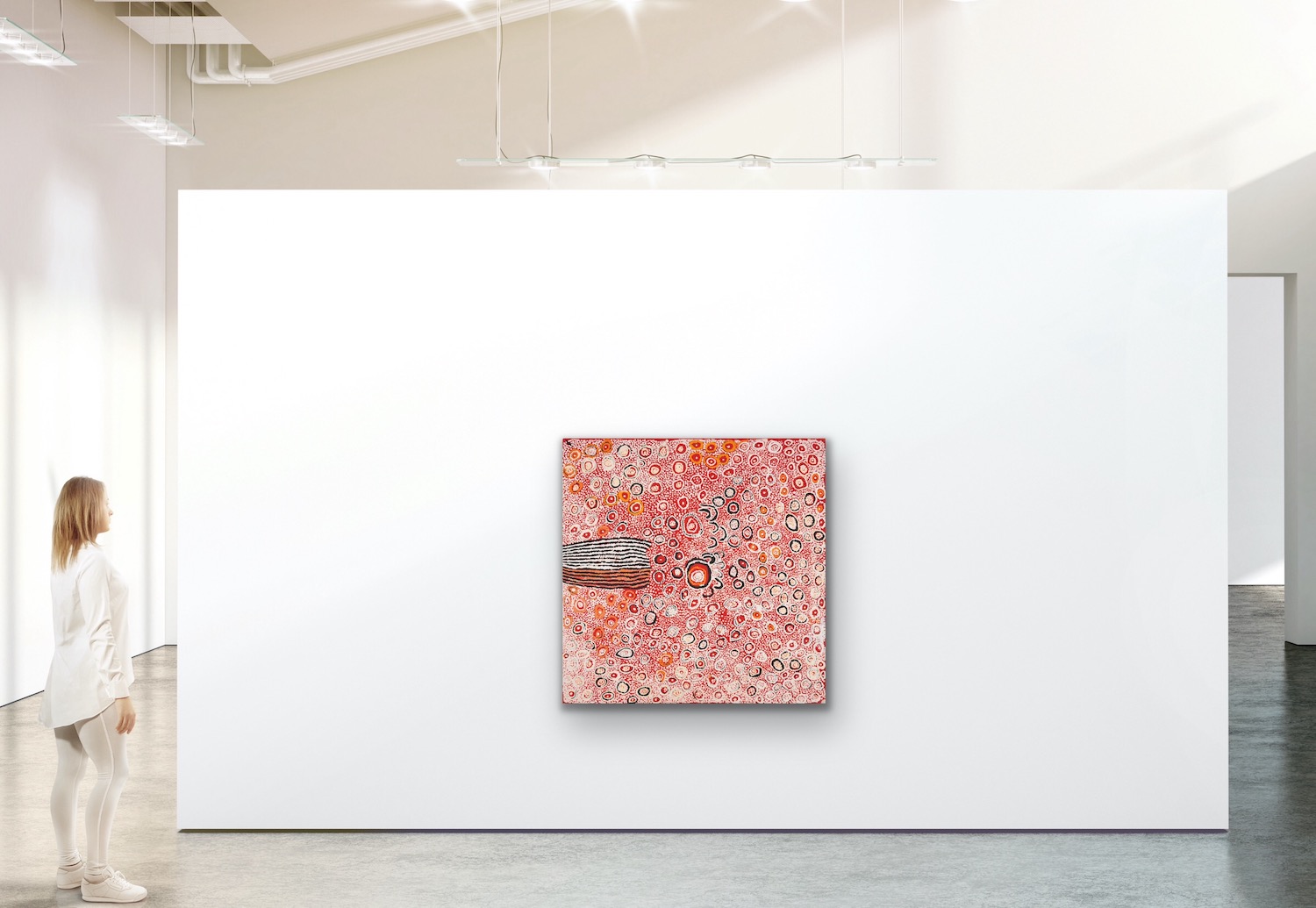 "This painting depicts designs associated with the rock hole and soakage water site of Marrapinti, to the west of the Pollock Hills in Western Australia.