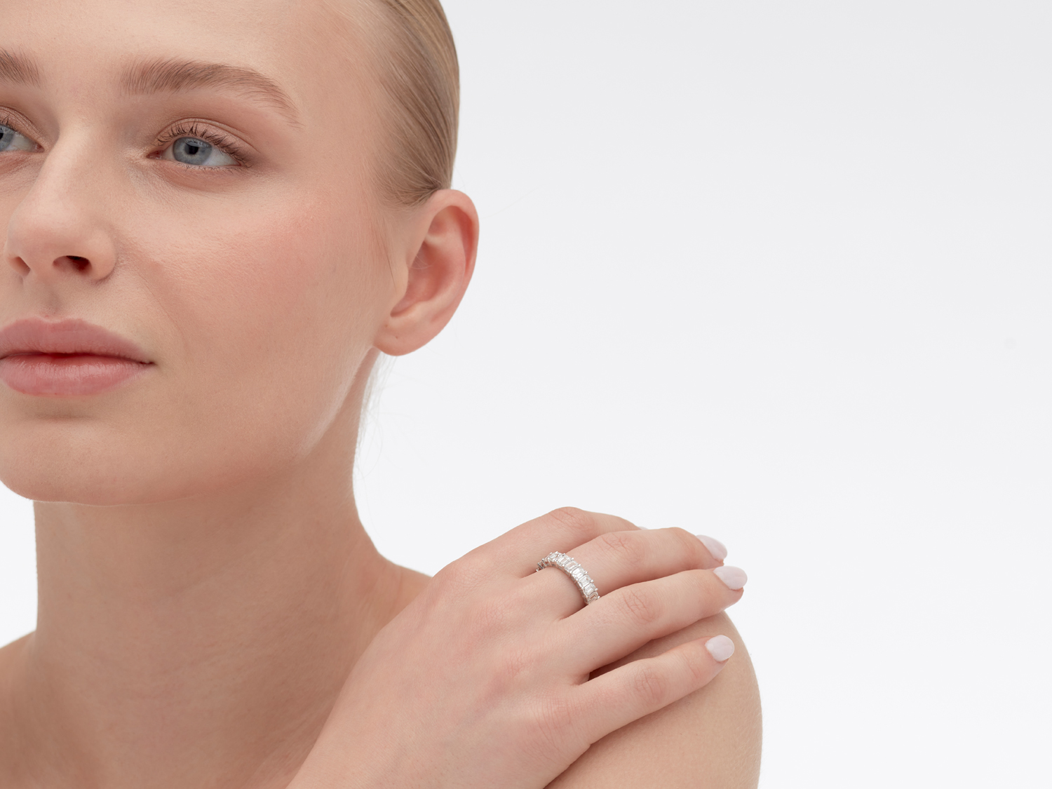 Of full circle design, comprising claw-set emerald-cut diamonds together weighing approximately 5.73 carats, size N.