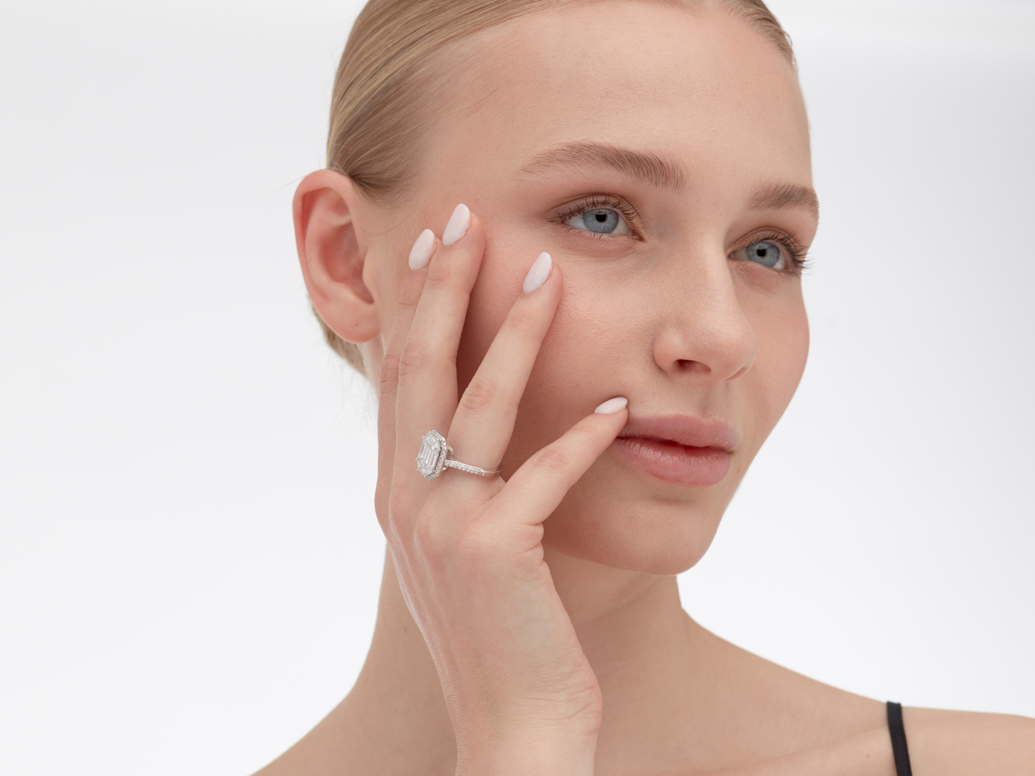 Centring an octagonal panel of illusion-set calibre-cut diamonds within a border of brilliant-cut diamonds to diamond set shoulders, the diamonds together weighing approximately 2.39 carats, size N.