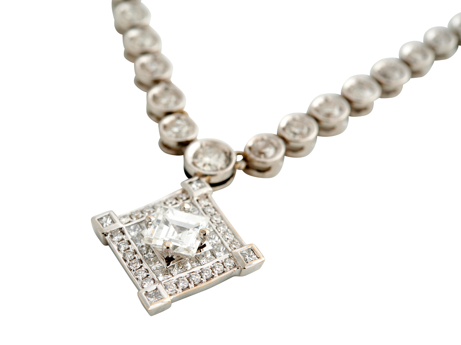 Comprising a diamond shaped pendant centring an asscher-cut diamond within a surround of princess and brilliant-cut diamonds, to an integral graduating bezel-set brilliant-cut diamond riviere style necklace, the diamonds together weighing approximately 6.50 carats, completed by a tongue and groove clasp, length 455mm, gross weight approximately 29.2 grams.