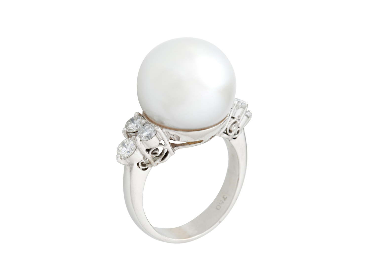 Centring a near round pearl of white hues measuring approximately 14.80mm, flanked by trefoils of claw-set brilliant-cut diamonds together weighing approximately 0.80 carats, size N.