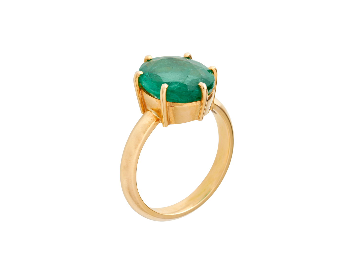 Claw-set with an oval-cut emerald weighing approximately 5.25 carats, size P.