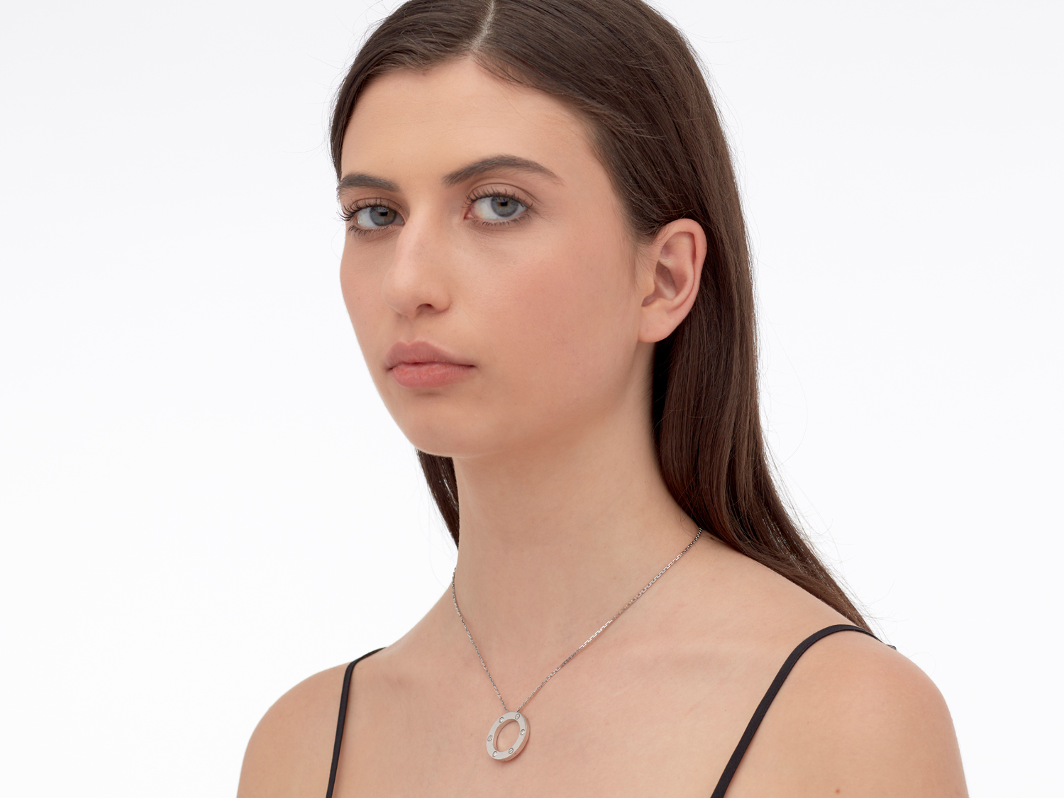 The open circular pendant, decorated at intervals with three brilliant-cut diamonds together weighing approximately 0.09 carats, alternating between applied screwhead motifs, suspended from an elongated box link chain, completed by a parrot clasp, signed Cartier and numbered Q02810, pendant diameter 24mm, necklace length 420mm, gross weight approximately 14.2 grams.