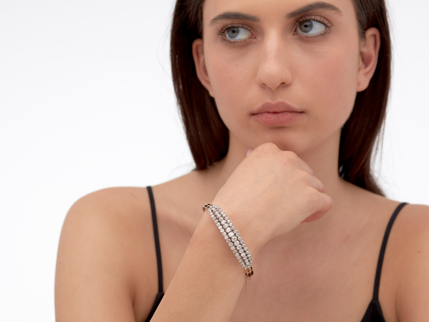 The hinged oval bangle, the top set with three rows of bezel-set old European-cut diamonds together weighing approximately 4.94 carats, inner circumference 175mm, gross weight approximately 22.9 grams.
