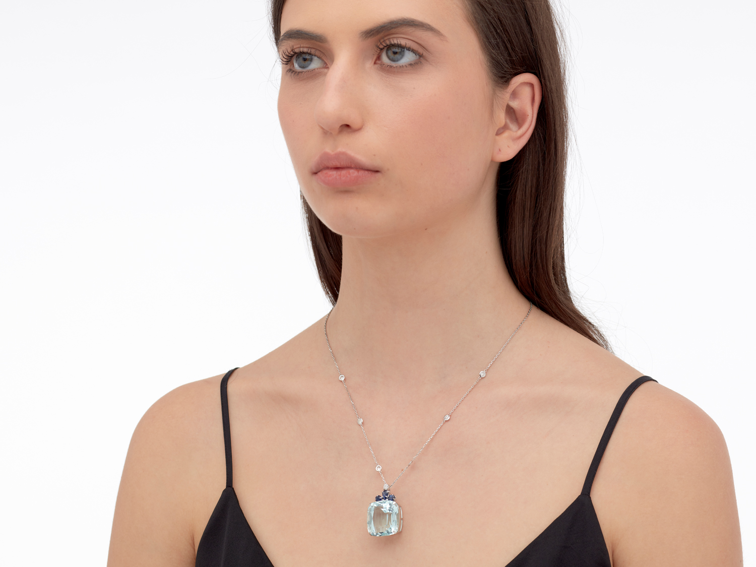 Comprising a claw-set cushion-cut aquamarine weighing 48.05 carats, below a sapphire and diamond cluster bale, suspended from a fine trace chain, bezel-set at intervals with brilliant-cut diamonds, the sapphires together weighing approximately 2.70 carats, the diamonds together weighing approximately 0.65 carats, pendant length 35mm, width 22mm, chain length 510mm-550mm adjustable.