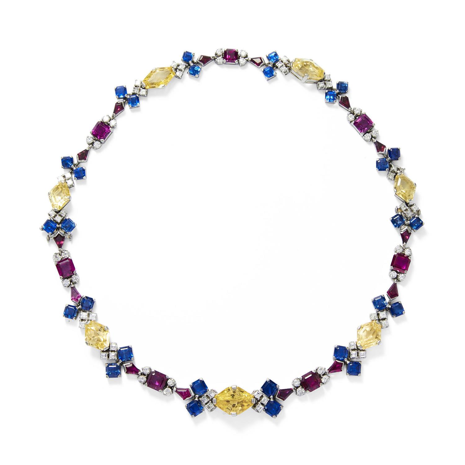Of geometric design, composed of a line of claw-set variously-shaped yellow sapphire, blue sapphire and ruby together weighing approximately 62.39 carats between carré and brilliant-cut diamond accents, completed by a box clasp, the diamonds together weighing approximately 3.12 carats, mounted in platinum, inner circumference 370mm, necklace detaches into sections measuring 185mm and 180mm, numbered.