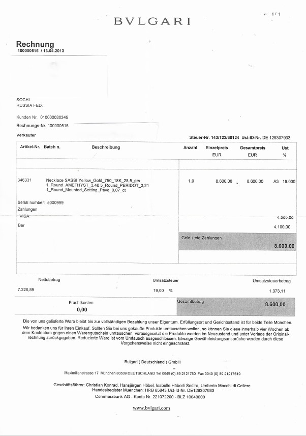 Accompanied by a facsimile Bulgari Invoice dated 13 April 2013.