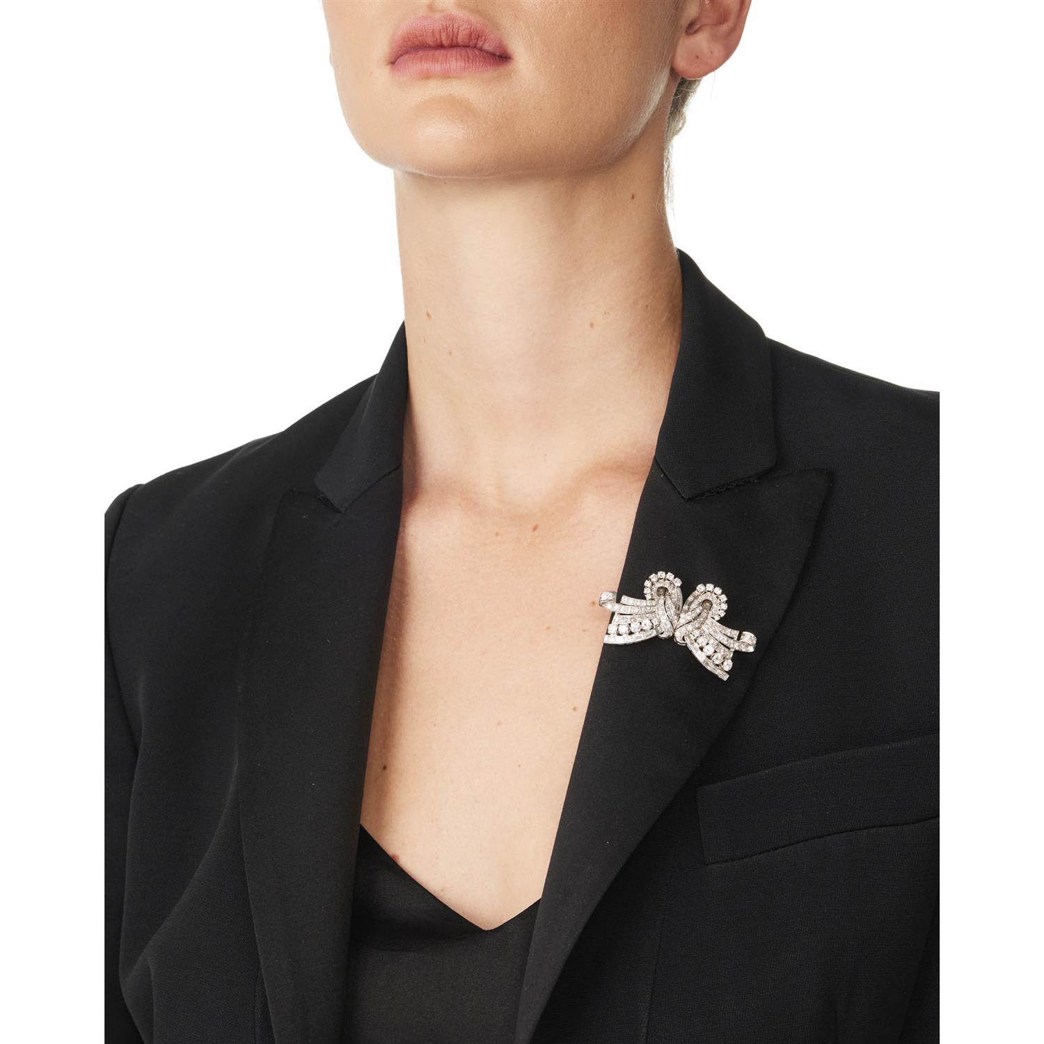 Designed as a pair of stylised cornucopias, embellished with baguette and brilliant-cut diamonds, the diamonds together weighing approximately 6.50 carats, mounted in platinum and 18ct white gold, separating into two clips, length 59mm, width 33mm.