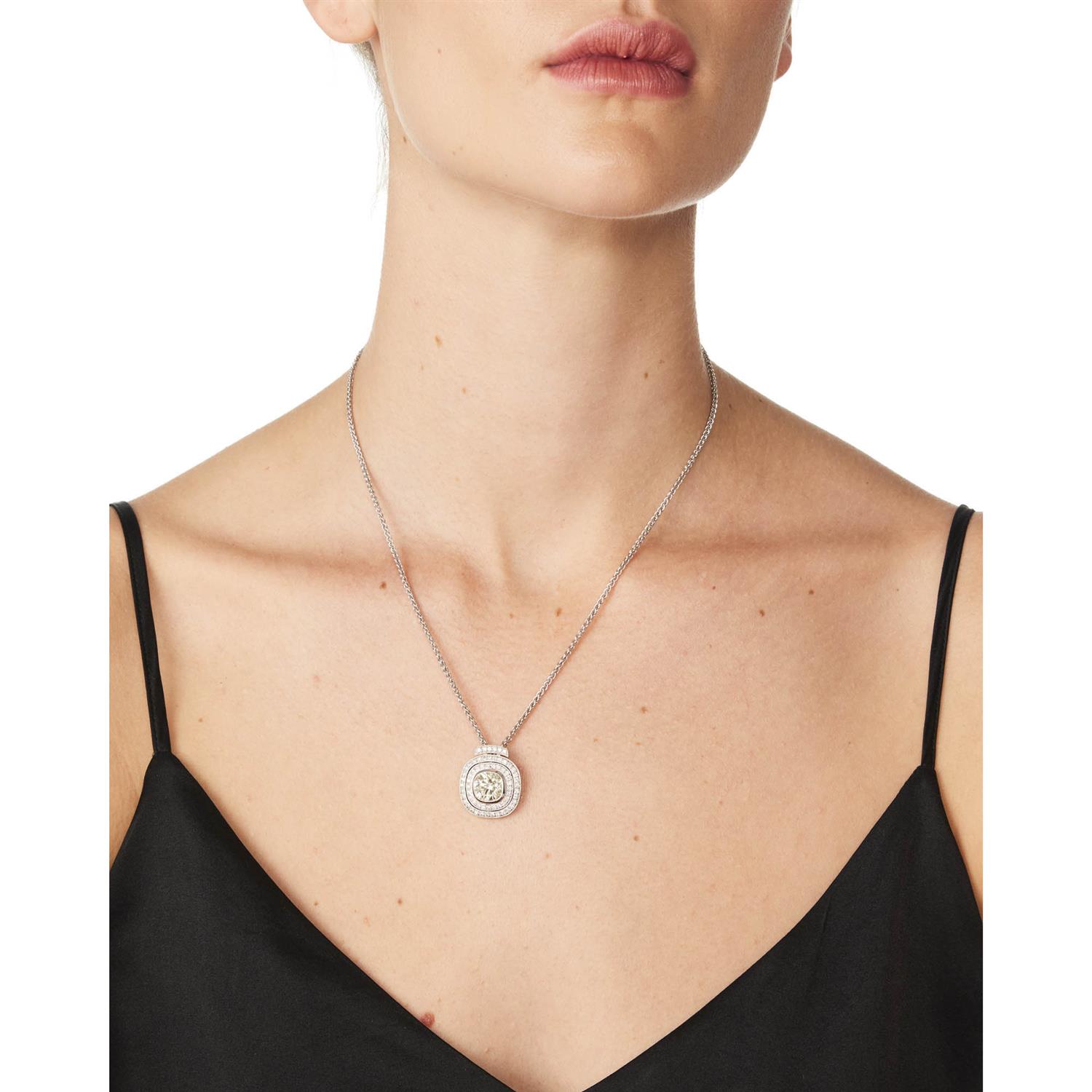 Of cluster design, centring a collet-set brilliant-cut diamond weighing approximately 4.40 carats, framed by a double halo of brilliant-cut diamonds, suspended by a trace link chain, the small diamonds together weighing approximately 0.63 carats, mounted in 18ct white gold, pendant length 23mm, inner circumference 470mm.