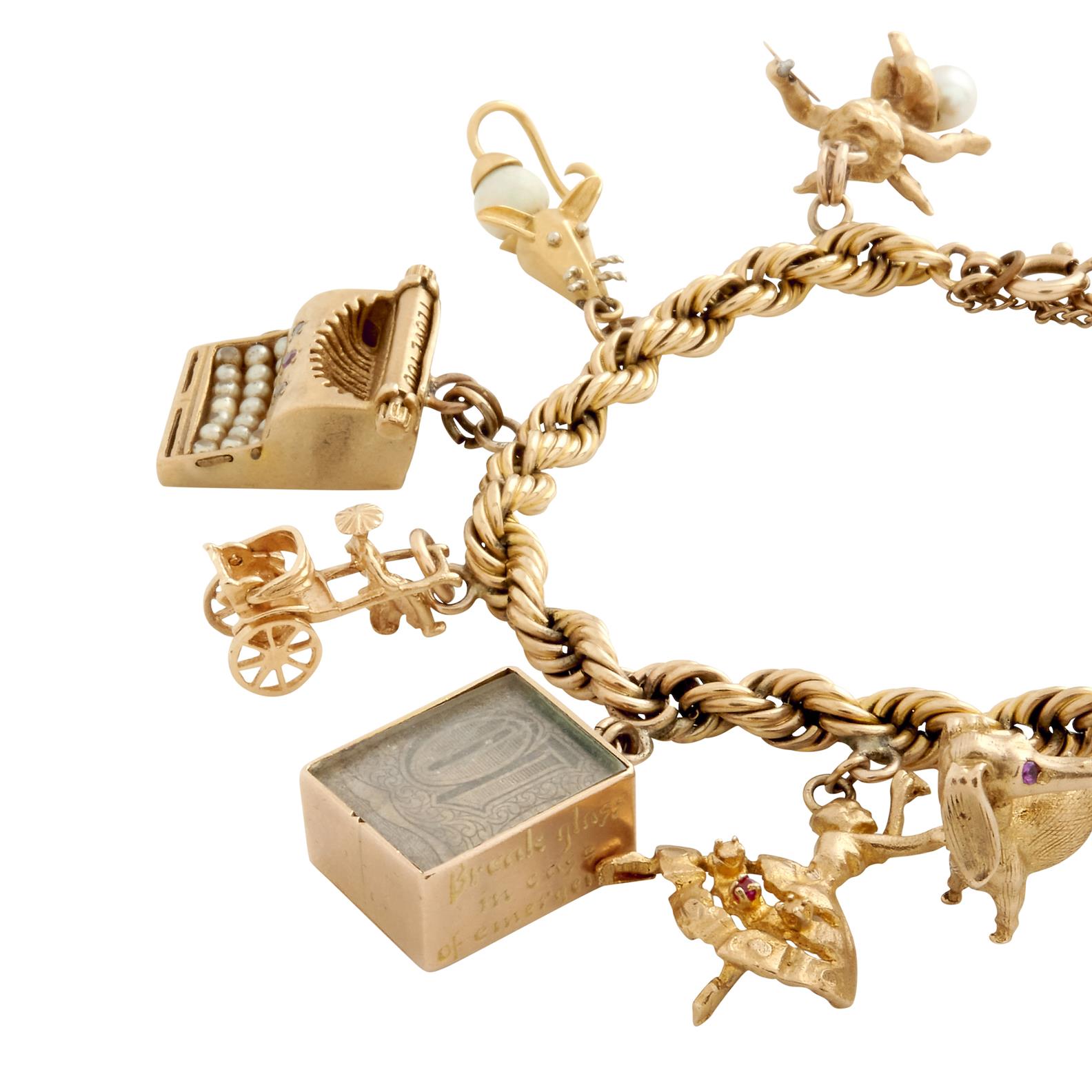 The rope twist chain suspending vintage charms in various golds and gold plate, completed by a bolt ring clasp, length 200mm, gross weight 70.3 grams.