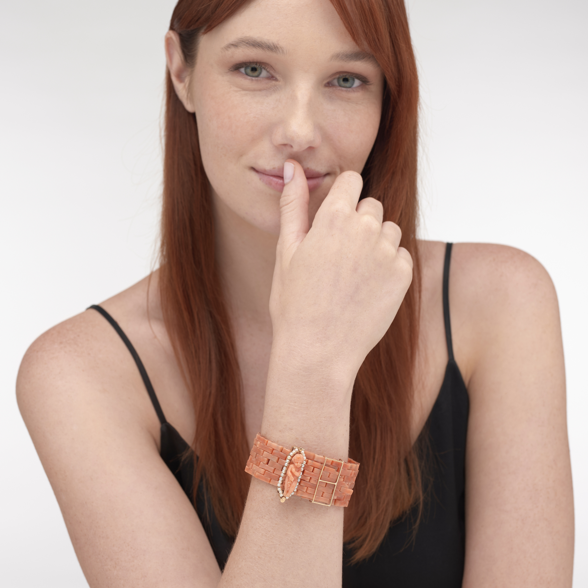 Comprising a strap of rectangular coral links, completed by a decorative clip clasp featuring a carved coral cherub within a surround of cultured pearls, length adjustable.