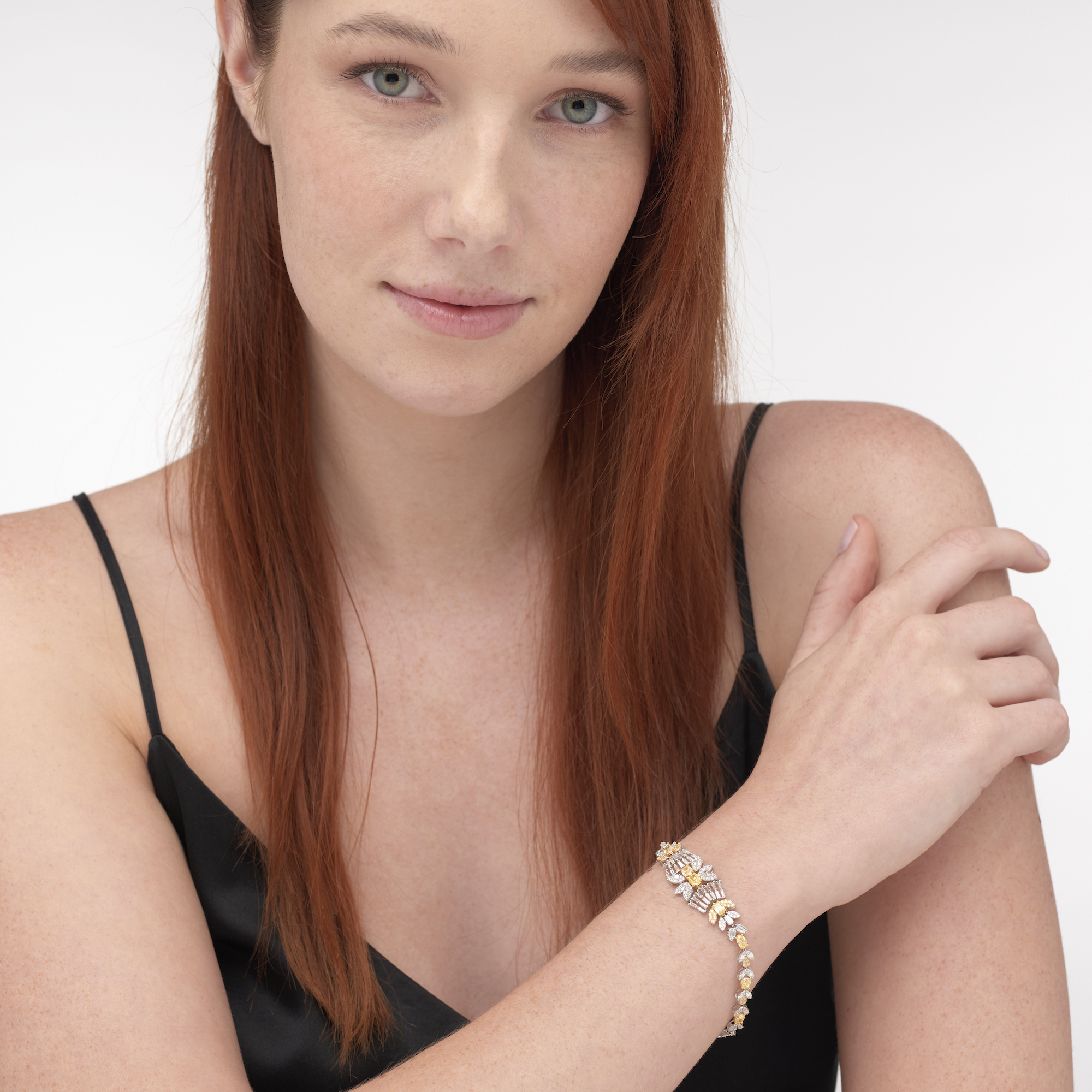 Centring a floral and geometric panel flanked by floral links, set throughout with vari-cut yellow and colourless diamonds, the yellow diamonds together weighing approximately 5.11 carats, the colourless diamonds together weighing approximately 0.88 carats, completed by a concealed tongue and groove clasp, length 180mm, gross weight 10.2 grams.