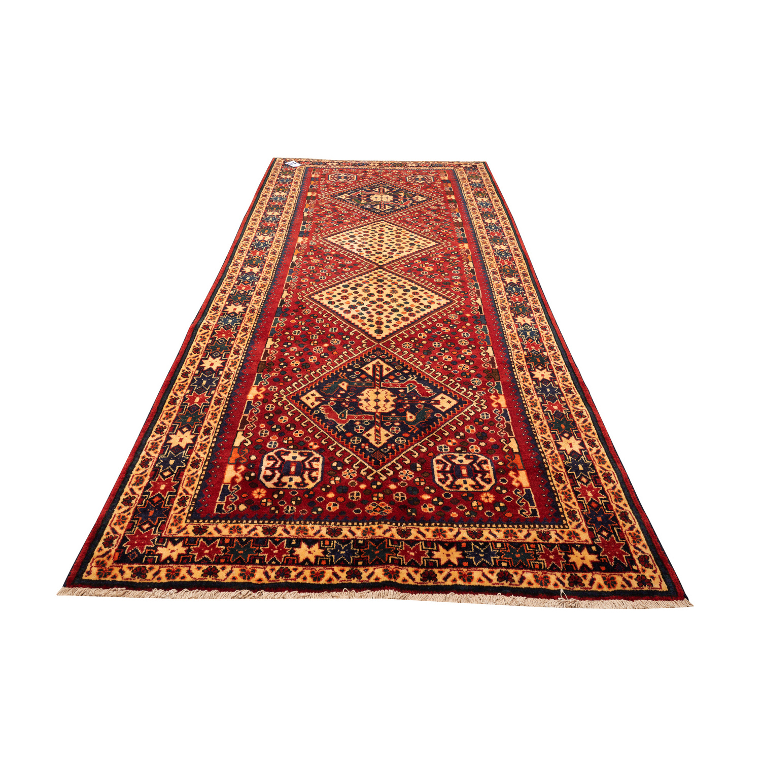 A TRIBAL PERSIAN QASHQAIE RUG. 100% HAND SPUN WOOL, NATURAL DYES. HAND-KNOTTED TRIBAL QASHQAIE WEAVE FROM THE FARS PROVINCE WITH TRIBAL DESIGN OF CONTINUING DIAMOND-SHAPED HOOKED MEDALLION CONTAINING AN AMULET AND TRIBAL MOTIFS, SET WITHIN A SOFT RED FIELD OF TRIBAL MOTIFS. BORDER OF STAR AND FLOWER HEAD MOTIFS. SIZE: 330 X 160 CM ORIGIN: IRAN – RRP: $2,700 DOCUMENTATION OF AUTHENTICITY INCLUDED