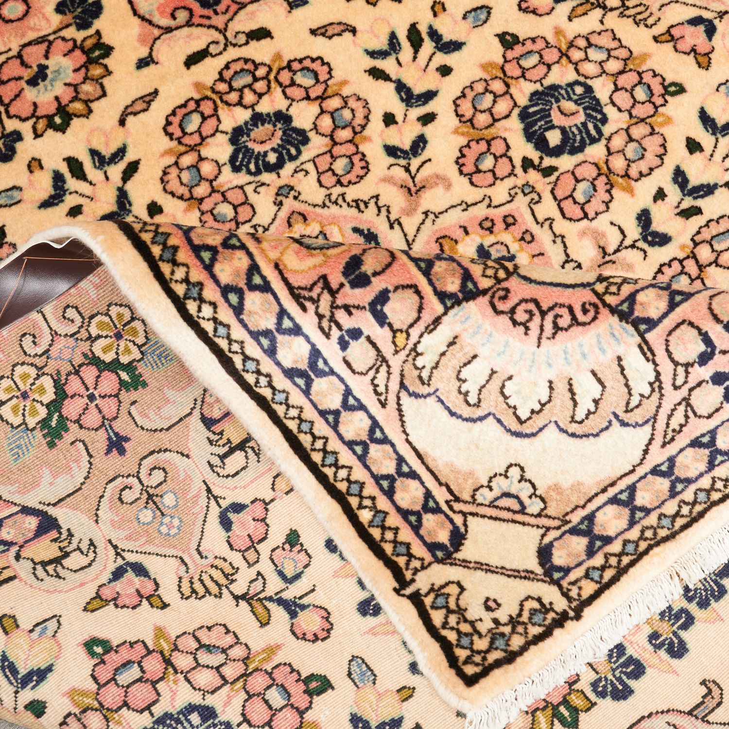 A FINE PERSIAN BIDJAR, 100% DENSELY WOVEN WOOL, HAND KNOTTED, SHEEN TO THE WOOL. CENTRAL FLORAL MEDALLION WITH VASES BEARING FLOWERS ON A CREAM FIELD. SHEEN TO THE WOOL PILE. SIZE: 155 X 116 CM ORIGIN: PERSIA – RRP: $2,100 DOCUMENTATION OF AUTHENTICITY INCLUDED.