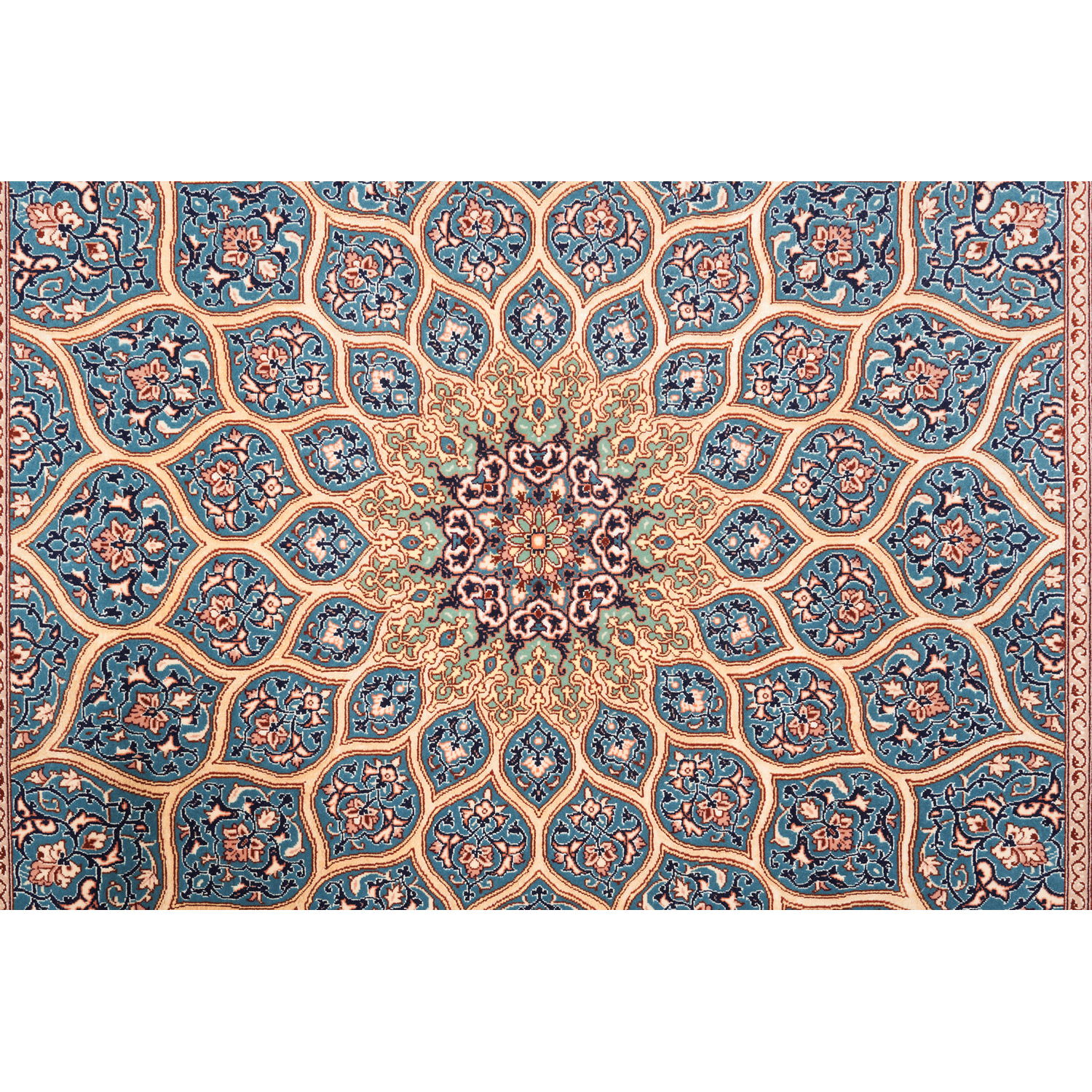 A WORLD CLASS PERSIAN ISFAHAN RUG. EXTREMELY FINE WEAVE WITH APPROXIMATELY 700,000 INDIVIDUAL KNOTS PER SQUARE METER ON A PURE PERSIAN CASPIAN SILK FOUNDATION FROM THE SIGNED MASTER WEAVING STUDIO OF ‘MOOSAVI THE PILE IS ALSO HEAVILY HIGHLIGHTED WITH SILK AND KORK WOOL IN MOST INTRICATE FAMOUS GONBAD DESIGN REPRESENTING THE ART OF ANCIENT PERSIAN ARCHITECTURE DATING BACK TO 2000 YEARS AGO. THE BALANCE OF COLOUR IS WELL EXECUTED IN TONES OF GOLD, DEEP TURQUOISE FIELD, LIGHT SAGE GREEN, IVORY SILK, AND COGNAC HIGHLIGHTS THROUGHOUT. SIZE: 222 X 148 CM ORIGIN: IRAN – RRP: $16,000 DOCUMENTATION OF AUTHENTICITY INCLUDED.