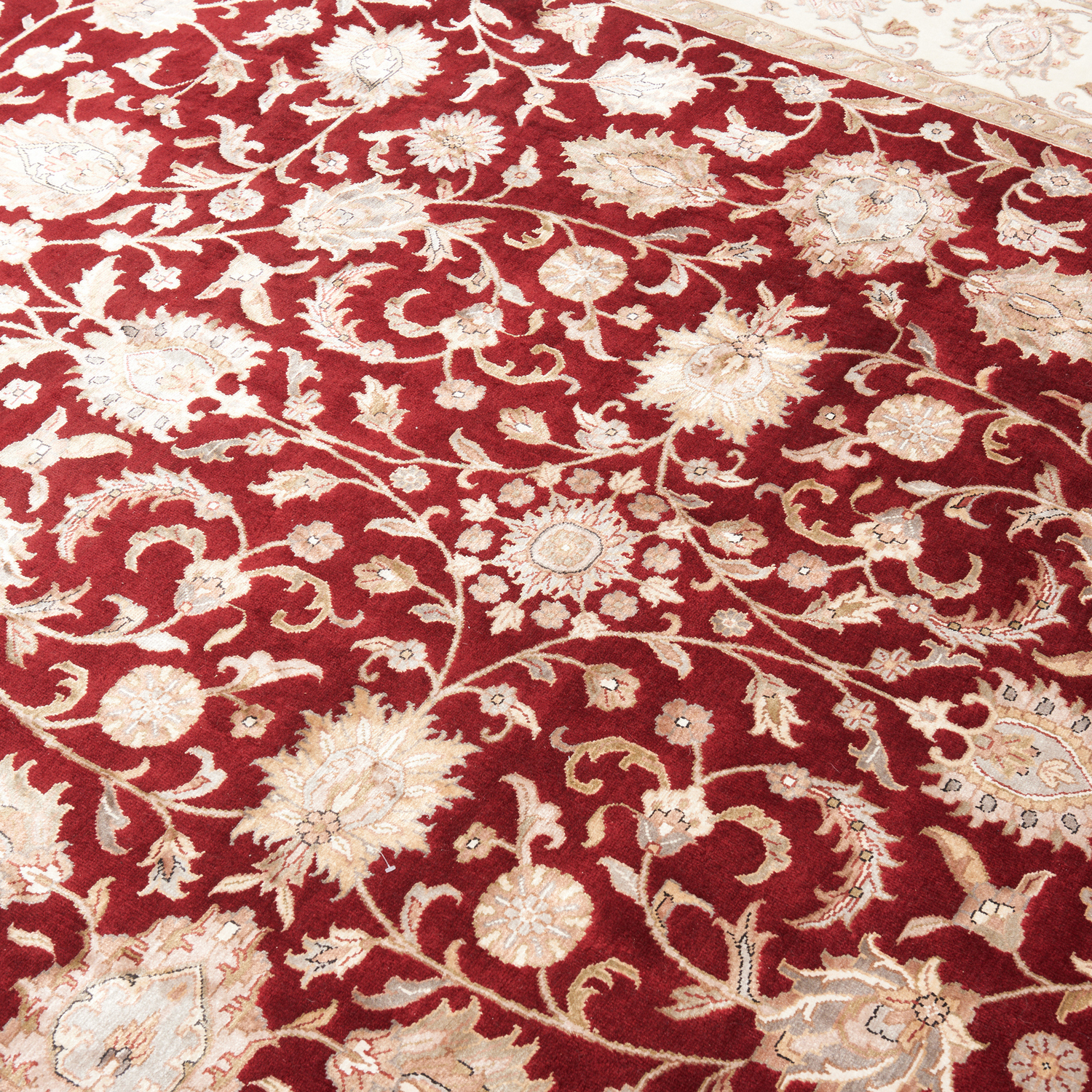A NEW SOLID TABRIZ DESIGN RUG, 100% WOOL AND TENCEL SILK. ALL OVER PALMETTE DESIGN IN SILVER, TAUPE ON A DEEP BURGUNDY BACKGROUND. SIZE: 343 X 247 CM ORIGIN: IRAN – RRP: $7,800 DOCUMENTATION OF AUTHENTICITY INCLUDED.