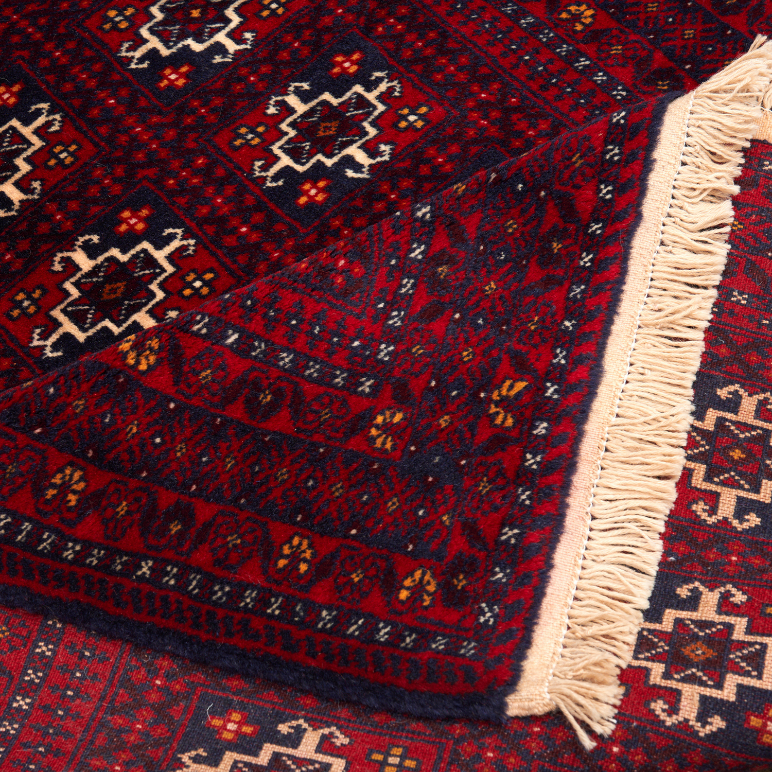 A FINE TRIBAL PERSIAN TURKOMAN HEYDARI RUG. 100% WOOL PILE, WITH APPROXIMATELY 350,000 KNOTS PER SQUARE METRE. FINELY HAND-KNOTTED TRIBAL WEAVE WITH TRADITIONAL DESIGN OF ALL-OVER TURKOMAN GUL MOTIFS IN A VERTICAL PATTERN SET WITHIN A RED FIELD, WITH TONES OF CREAM; NAVY AND GOLD. SIZE: 165 X 110 CM ORIGIN: PERSIA – RRP: $1,800 DOCUMENTATION OF AUTHENTICITY INCLUDED.