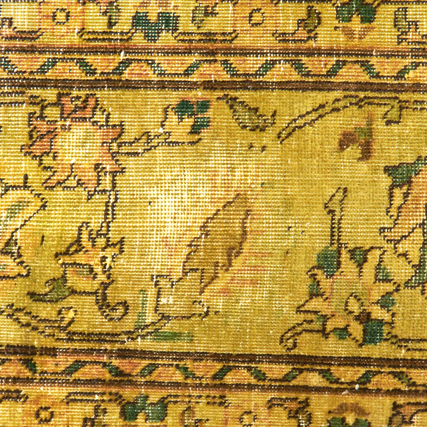 A SUPERB CONTEMPORARY VINTAGE OVER-DYED PERSIAN TABRIZ CARPET, VINTAGE PILE. AN ALL-OVER DESIGN OF ESLIMI SCROLLS, PALMETTES AND SAZ LEAVES. THE ENTIRE IS OVER- DYED IN GOLD, LIME, COGNAC AND HIGHLIGHTED IN RUST TONES. EX GALLERY EXHIBITED SIZE: 358 X 246 CM-ORIGIN: PERSIA – RRP: $4,500 DOCUMENTATION OF AUTHENTICITY INCLUDED.