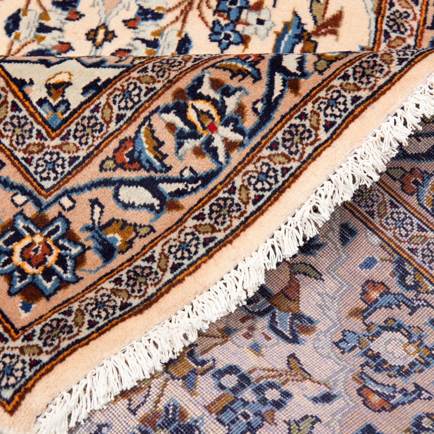 A PERSIAN KASHAN HALL RUNNER. 100% SOLID DENSE WOOL PILE. FINELY HAND-KNOTTED. CLASSIC KASHAN DESIGN OF REPEATING CHANDELIER MEDALLIONS IN LATTE AND FRENCH BLUE TONES ON AN IVORY FIELD OF PALMETTES AND FLORAL SPRAYS. BORDER OF ROSETTES, SCROLLS AND LEAF FORM. SIZE: 423 X 95 CM ORIGIN: PERSIA - RRP: $3,800 DOCUMENTATION OF AUTHENTICITY INCLUDED.