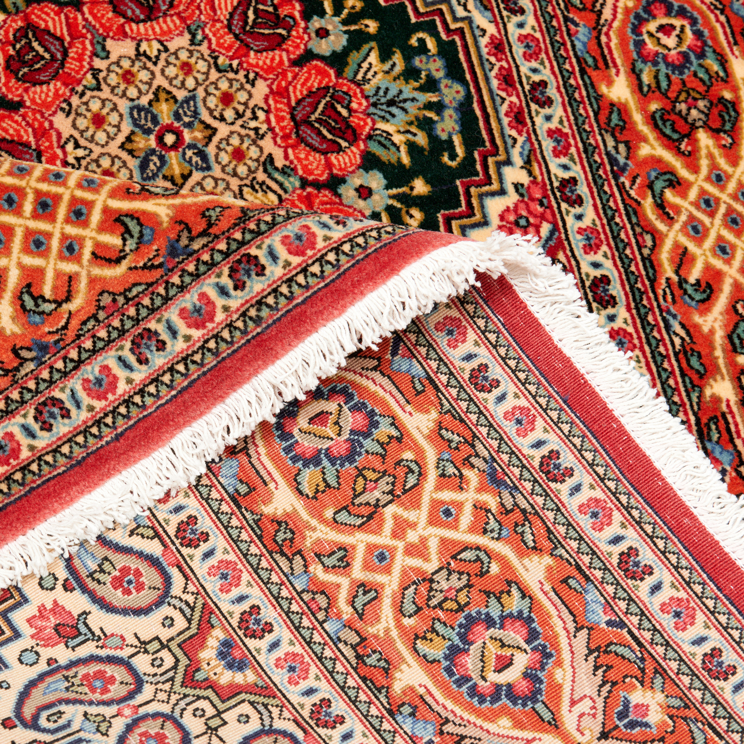 A SUPERB AND NEW PERSIAN QUM RUG, 100% LAMBS WOOL, WITH APPROXIMATELY 500,00 KNOTS PER SQUARE METRE, SOLID AND DENSE. ALL OVER HEXAGONAL MEDALLIONS FILLED WITH PAISLY, URNS BEARING FLORAL SPRAYS WITH BIRD MOTIFS, ROSE MOTIFS. CARTOUCHE BORDER FILLED WITH TRIBAL KNOT AND FLORAL MOTIFS. SIZE: 223 X 135 CM ORIGIN: PERSIA – RRP: $5,200 DOCUMENTATION OF AUTHENTICITY INCLUDED