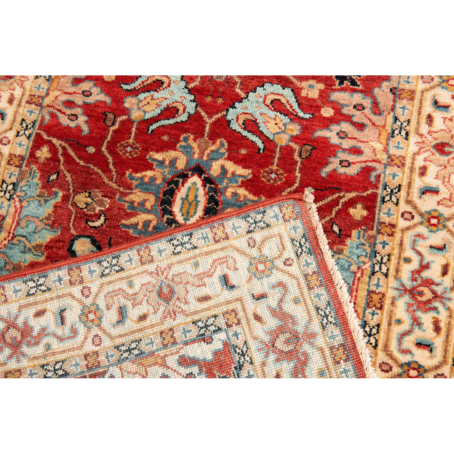 A NEW SERAPI DESIGN HALL RUNNER. VERY FINELY HAND-KNOTTED WITH THE FINEST HAND SPUN WOOL AND NATURAL DYES. ALL OVER PALMETTES AND FLORAL MOTIF DESIGN. DESIGN IN TONES OF RUST, IVORY, LIGHT BLUE, AND INDIGO BLUE. SIZE: 428 X 78 CM RRP $3,200 ORIGIN: AGRA TAJ MAHAL PROVINCE DOCUMENTATION OF AUTHENTICITY INCLUDED.