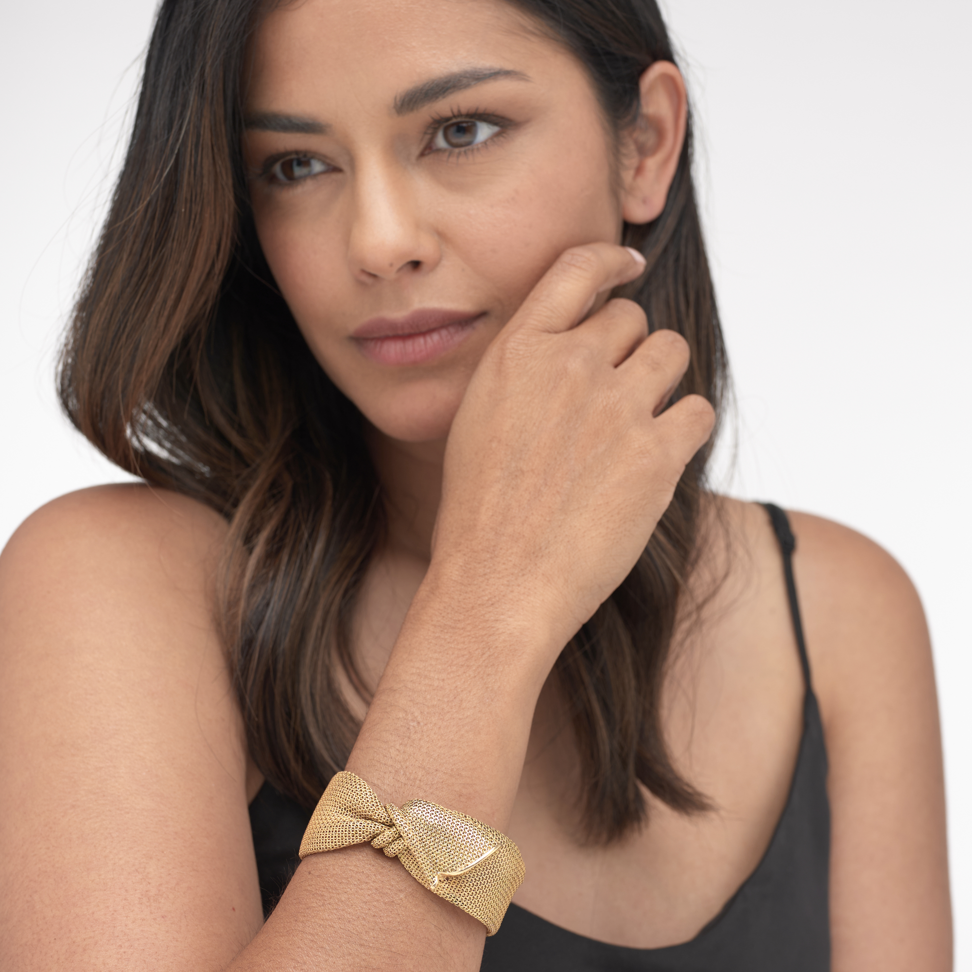 The mesh strap centring a knot motif, completed by a tongue and groove clasp, length 190mm, gross weight 45.1 grams.
