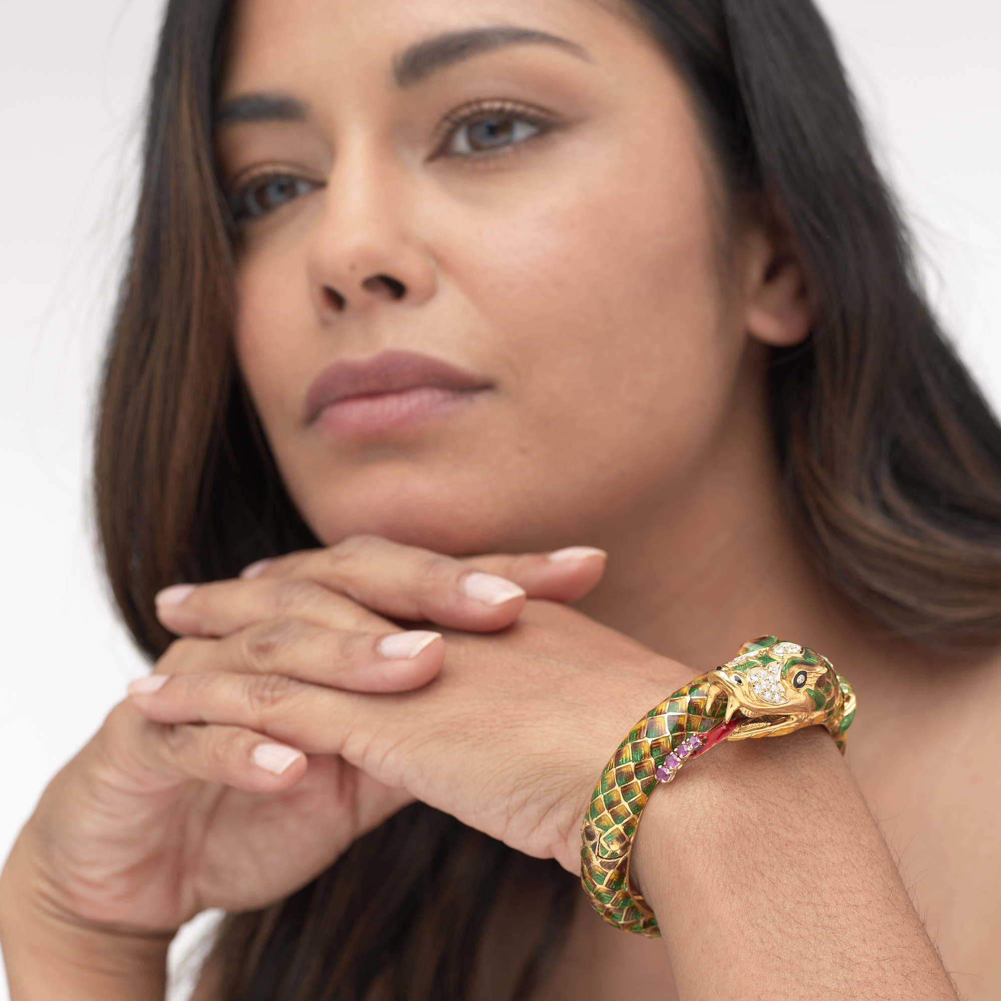 Modelled as a coiled serpent, set throughout with green, brown and yellow enamel, the head decorated with brilliant-cut diamonds together weighing approximately 0.65 carats, the tongue detailed with red enamel and four circular-cut rubies together weighing approximately 0.25 carats, Portuguese marks, inner circumference approximately 165mm, gross weight 95.4 grams.
