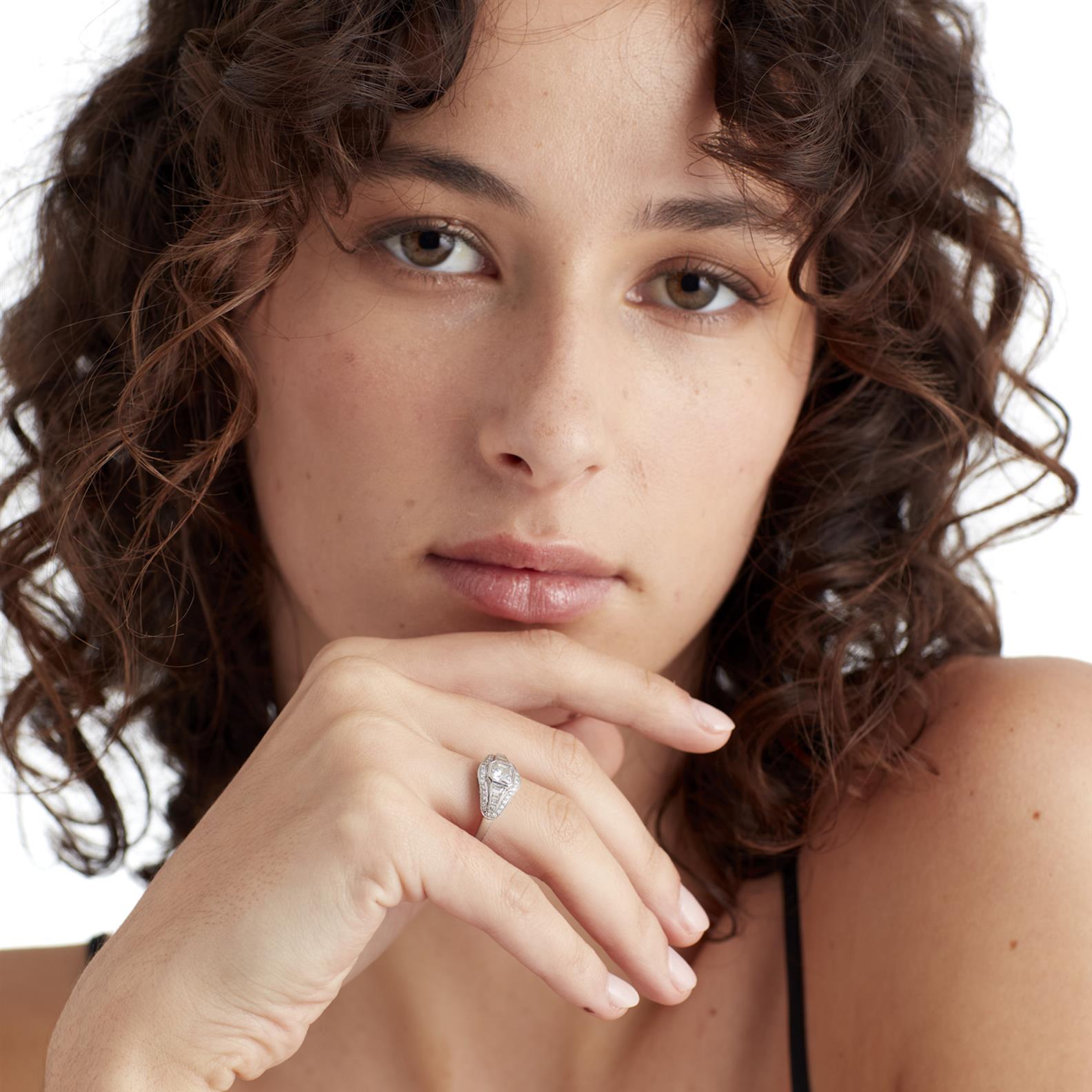 Centring a square radiant-cut diamond weighing approximately 0.70 carats, channel-set either side with tapering baguette-cut diamonds to grain-set brilliant cut diamonds to the edges together weighing approximately 0.30 carats, size M1/2, gross weight approximately 4.7 grams.