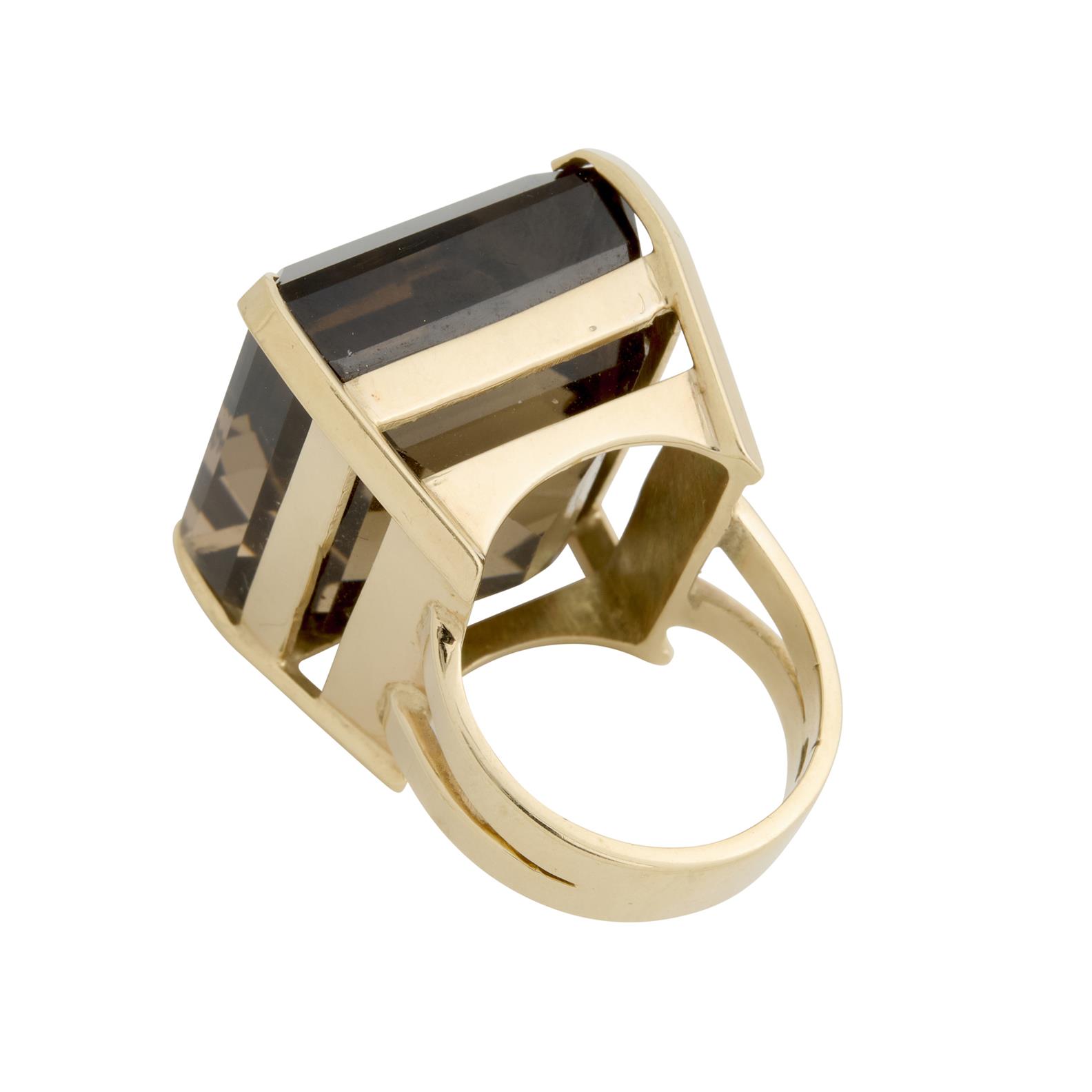 Centring a claw-set square-cut smoky quartz weighing approximately 40.00 to 50.00 carats, mounted in 9ct gold, size M1/2, gross weight approximately 21 grams.