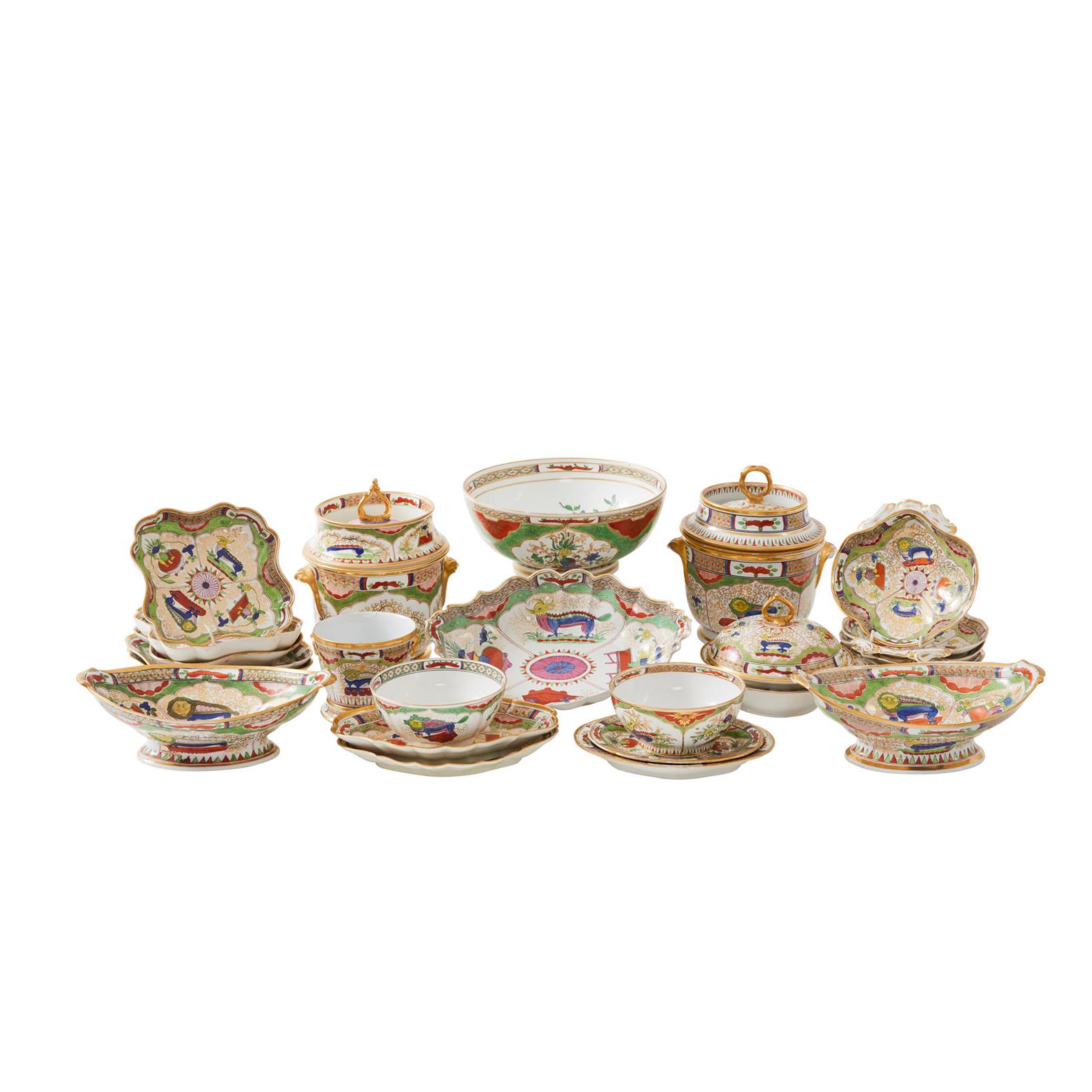 AN EXTENSIVE ENGLISH PORCELAIN 'DRAGONS IN COMPARTMENTS' ASSEMBLED DINNER AND DESSERT SERVICE