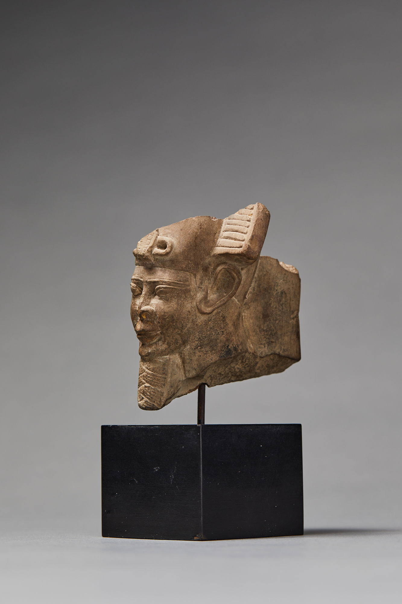 AN EGYPTIAN ANHYDRITE KOHL POT AND A CARNELIAN COVER, PROBABLY MIDDLE KINGDOM 12TH DYNASTY (1991-1778 B.C.E), WITH TWO LUG HANDLES A...