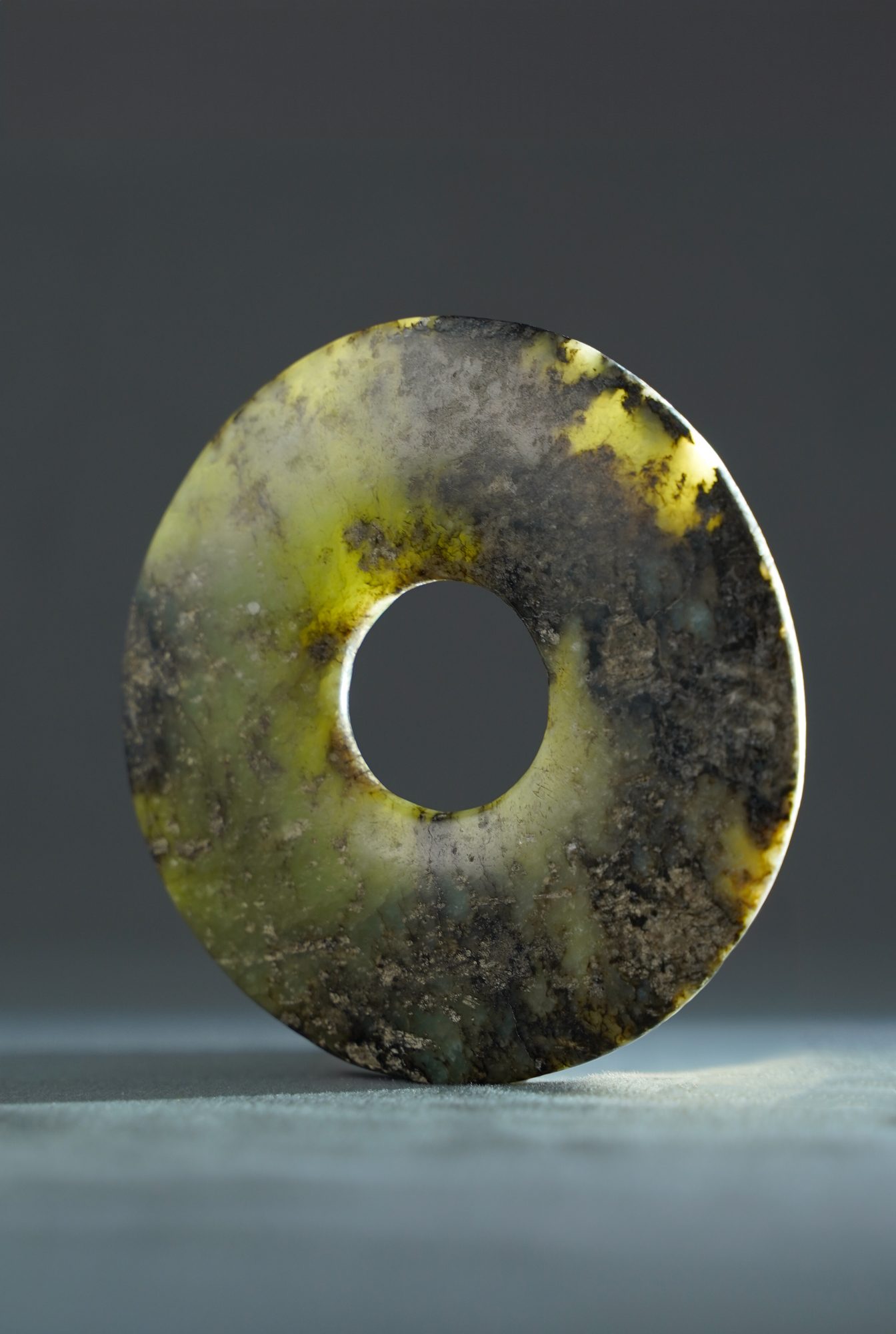A CHINESE MOTTLED CELADON JADE DISC, BI, POSSIBLY HAN DYNASTY (202 B.C.-220 A.D.)