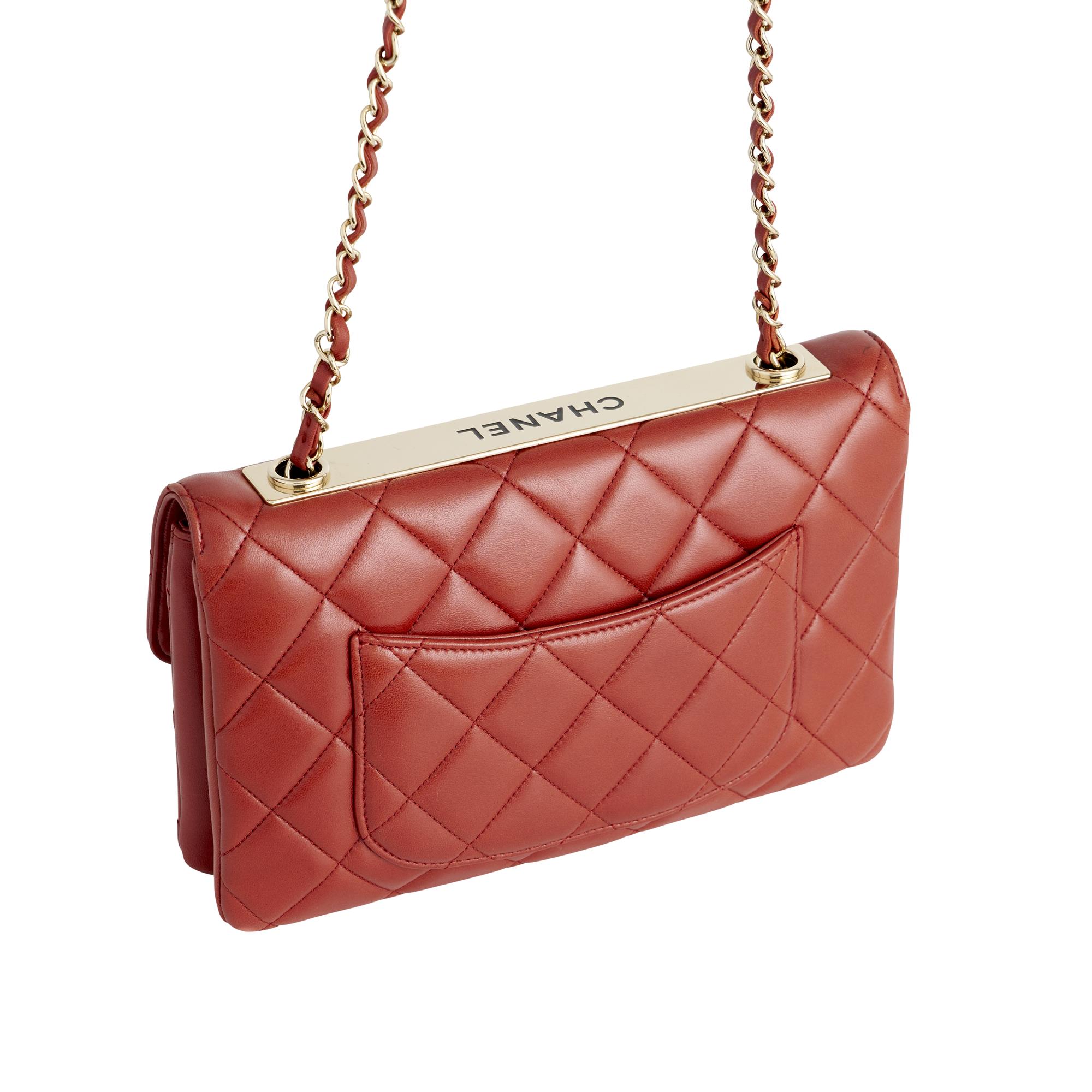 Styled in brick red diamond quilted lambskin, featuring CC turnlock closure and interlaced shoulder strap, 27 x 16 x 6.5cm.