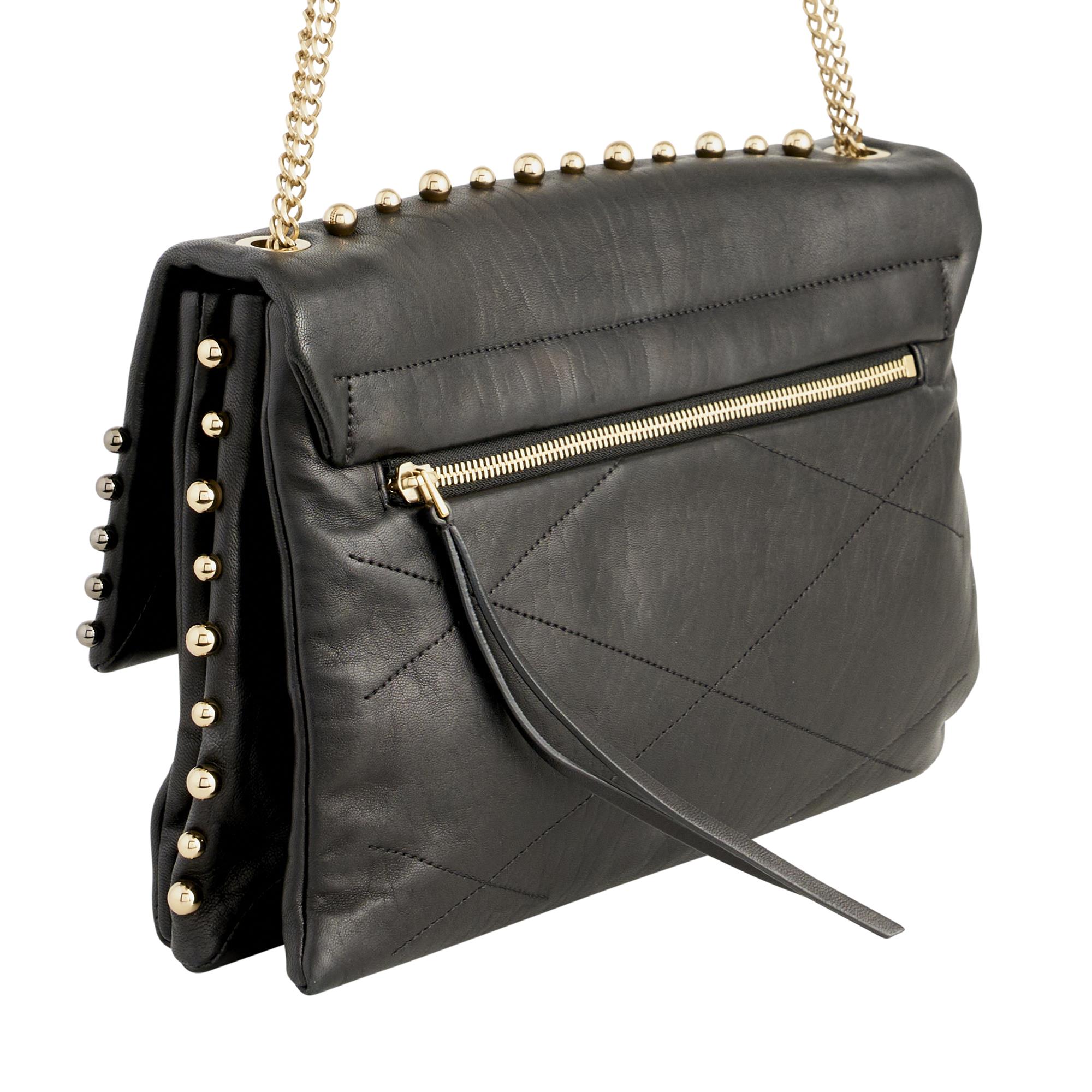 Styled in black leather with gold tone hardware, chain strap and stitching and ball studded details, 21 x 30 x 17cm.