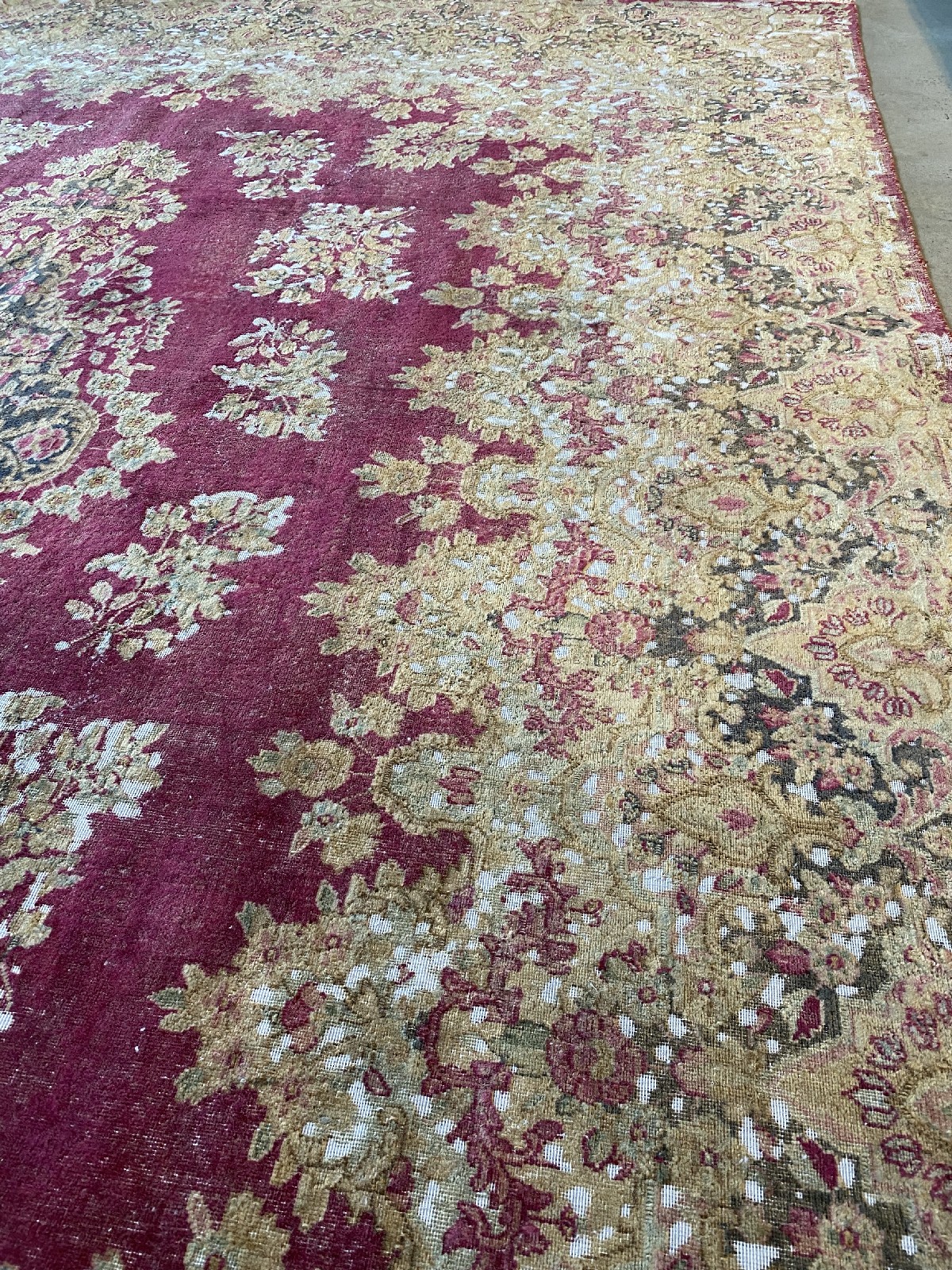 AN EX-GALLERY DISPLAYED PERSIAN KERMAN OVERDYED WOOLEN RUG. OLD HANDKNOTTED PILE. WITH A CENTRAL ANTIQUE-STYLE MEDALLION ON A RUBY RED FIELD, WITH FLORAL SPRAYS IN BISCUIT GOLD TONES. ORIGIN: IRAN (402 X 301 CM) (PLEASE NOTE THERE MAY BE SOME COLOUR VARIATION FROM PHOTOGRAPH)