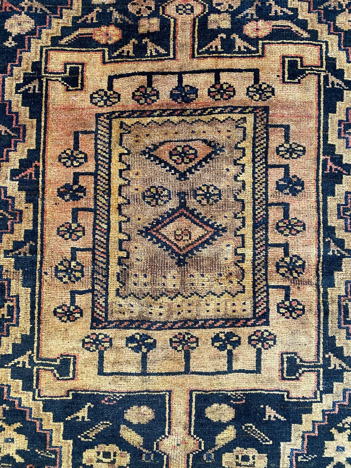 A 1960's TRIBAL LURI, 100% HAND-SPUN WOOLEN RUG WITH ALL NATURAL VEGETABLE DYES. TRIBAL DESIGN OF RECTANGULAR ANCHORED MEDALLION WITH FLORAL MOTIFS SET WITHIN AN INDIGO-TONED FIELD OF FLORAL PATTERNS AND BIRD FORMS. IN CLEAN GALLERY CONDITION. ORIGIN: IRAN (210 X 130 CM) (PLEASE NOTE THERE MAY BE SOME COLOUR VARIATION FROM PHOTOGRAPH)