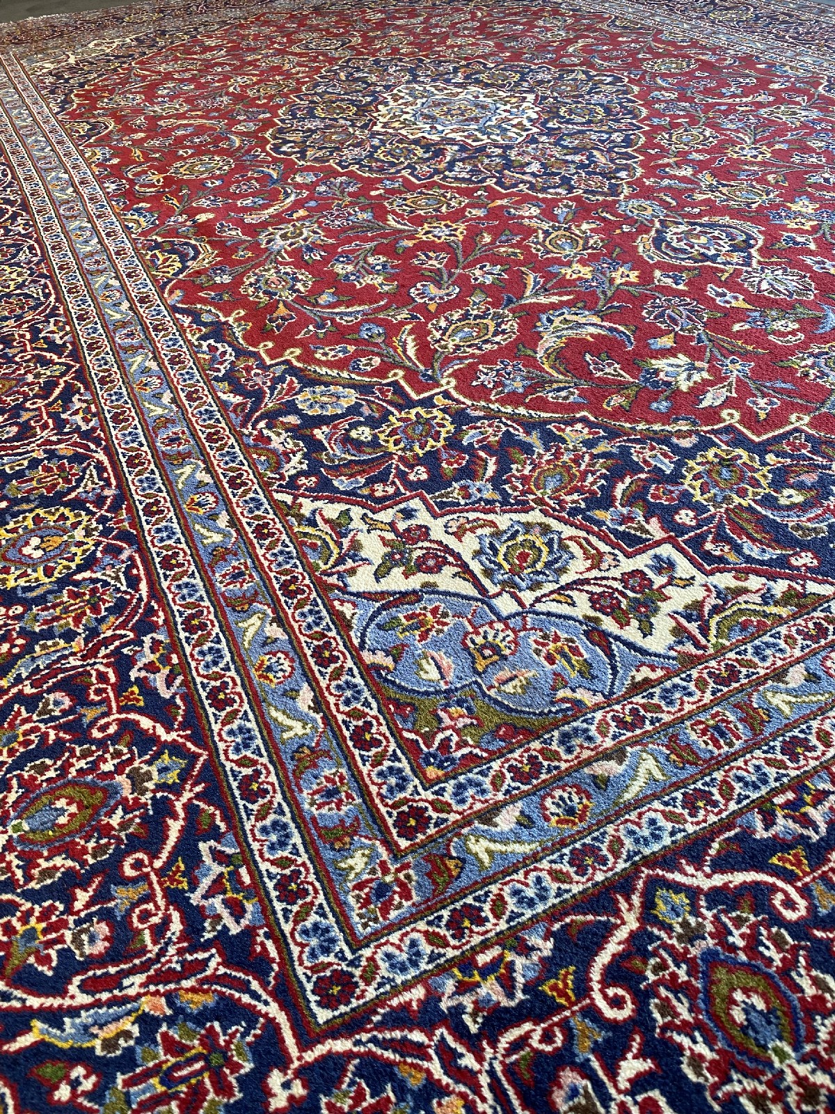 AN EX-GALLERY PERSIAN KASHAN 100% WOOLEN RUG. FINELY HAND-KNOTTED. CLASSIC KASHAN DESIGN OF ELONGATED CHANDELIER MEDALLION AND QUARTERED CORNER MEDALLIONS. IN A RED FIELD OF SHAH ABBASSI PALMETTES, FLORAL SPRAYS AND SAZ LEAVES, WITH HINTS OF AQUA. BORDER OF PALMETTES, SAZ LEAVES, IN NAVY AND BABY BLUE HUES. ORIGIN: IRAN (354 X 242 CM) (PLEASE NOTE THERE MAY BE SOME COLOUR VARIATION FROM PHOTOGRAPH)