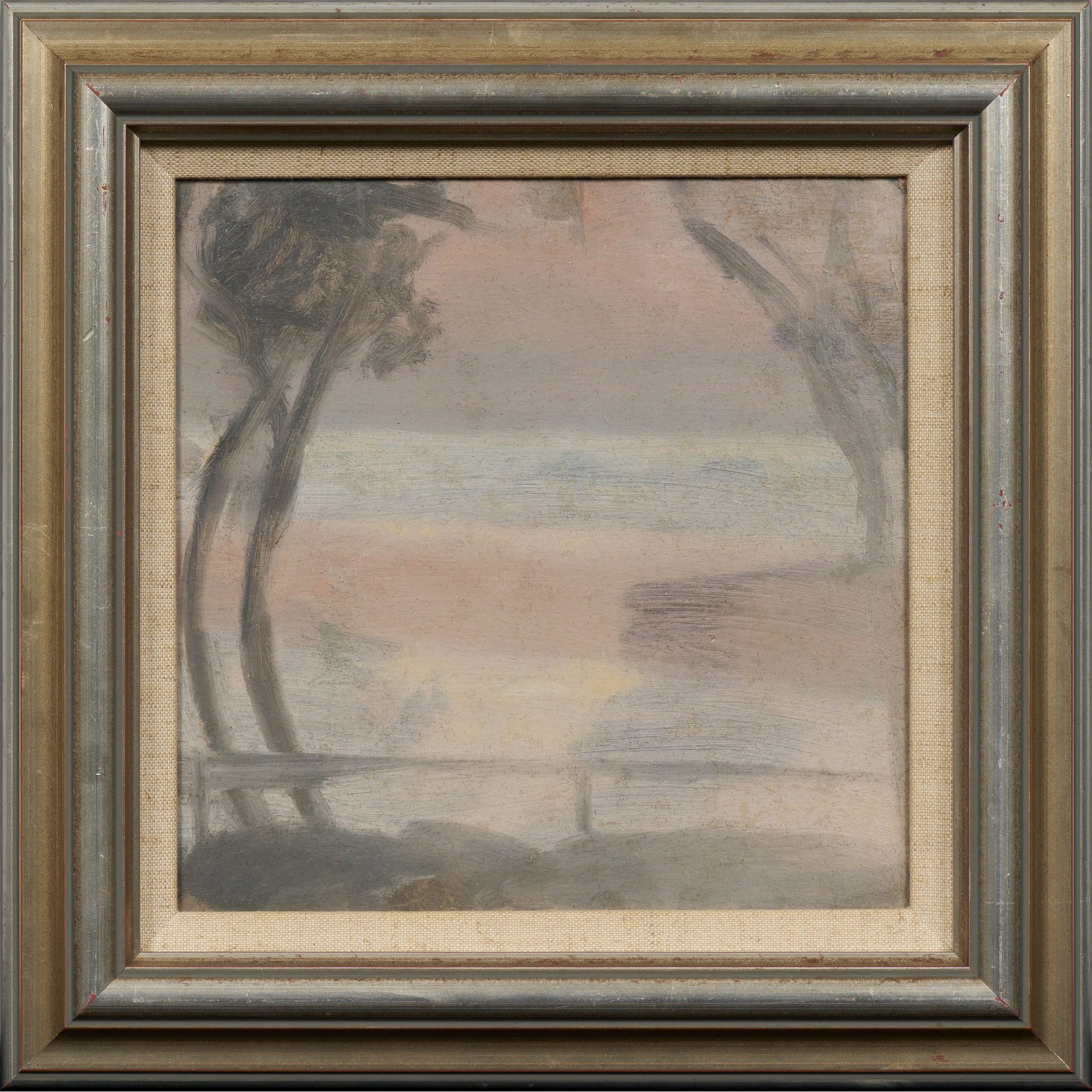 'Soft Evening' is one of the few artworks by Beckett that are dual sided. Verso lies a preparatory painting of a glistening cityscape at nightfall reminiscent of her earlier works of Princes Bridge c.1930. The duality of dark and light in her work is embodied on a singular board as the sun sets over the trees on one side and dusk falls onto the other.