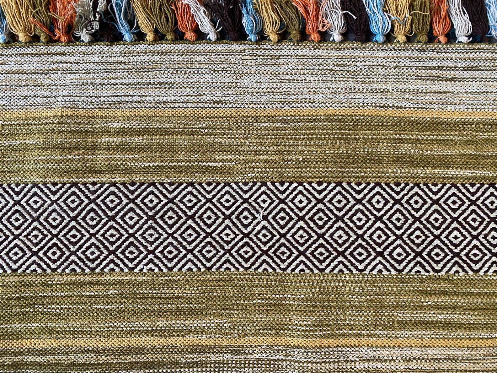 A NEW FLATWEAVE CHENILLE FLEECE KILIM WITH COLOURFUL TASSEL FRINGES. SOUTH AMERICAN DESIGN OF GEOMETRIC PATTERNS. HAND-WOVEN AND REVERSABLE. ORIGIN: INDIA (245 X 166 CM) (PLEASE NOTE THERE MAY BE SOME COLOUR VARIATION FROM PHOTOGRAPH)