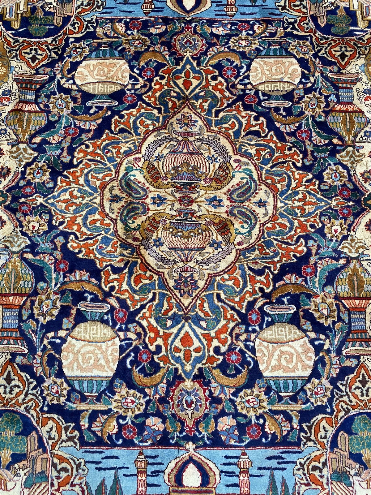 A PERSIAN ARCHAEOLOGY DESIGN KASHMAR WOOL RUG. HAND-KNOTTED CITY WEAVE FROM THE KHORASAN PROVINCE WITH TRADITIONAL DESIGN OF CENTRAL MEDALLION CONTAINING, EXCAVATED URNS AND MYSTICAL SIMORGH BIRDS, SET AGAINST PANELS CONTAINING HISTORICAL MONUMENTS, EXCAVATED URNS, AMPHORAS, COUNTRY SCENES AND SIMORGH BIRDS. THE ENTIRE IN SHADES OF INDIGO, CREAM, BLUE AND CARAMEL. EX-GALLERY DISPLAYED IN EXCELLENT CONDITION. CERTIFICATE OF AUTHENTICITY AND ORIGIN ON REQUEST. ORIGIN: IRAN (335 X 250 CM) (PLEASE NOTE THERE MAY BE SOME COLOUR VARIATION FROM PHOTOGRAPH)