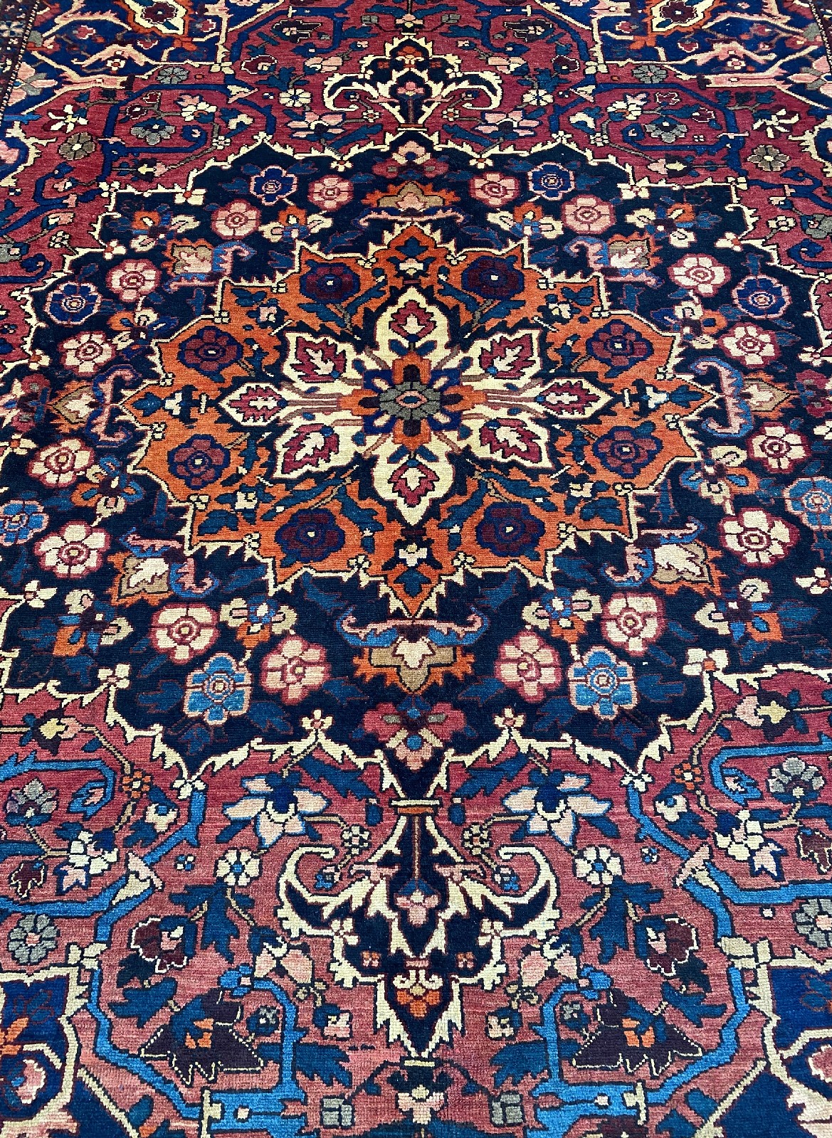 A LARGE PERSIAN BAKHTIAR WOOL RUG WITH ALL NATURAL DYES. BAKHTIARI WEAVE WITH TRADITIONAL NOMADIC DESIGN OF DOMINANT BOLD MEDALLION OF FLORAL MOTIFS, IN A MAROON-TONED FIELD OF RAMBLING VINES AND PALMETTES. BORDERED BY WILLOW CYPRESS TREES AND FLORAL SHRUBS. IN EXCELLENT CONDITION, EX-GALLERY DISPLAYED. CERTIFICATE OF AUTHENTICITY AND ORIGIN ON REQUEST. ORIGIN: IRAN (371 X 294 CM) (PLEASE NOTE THERE MAY BE SOME COLOUR VARIATION FROM PHOTOGRAPH)