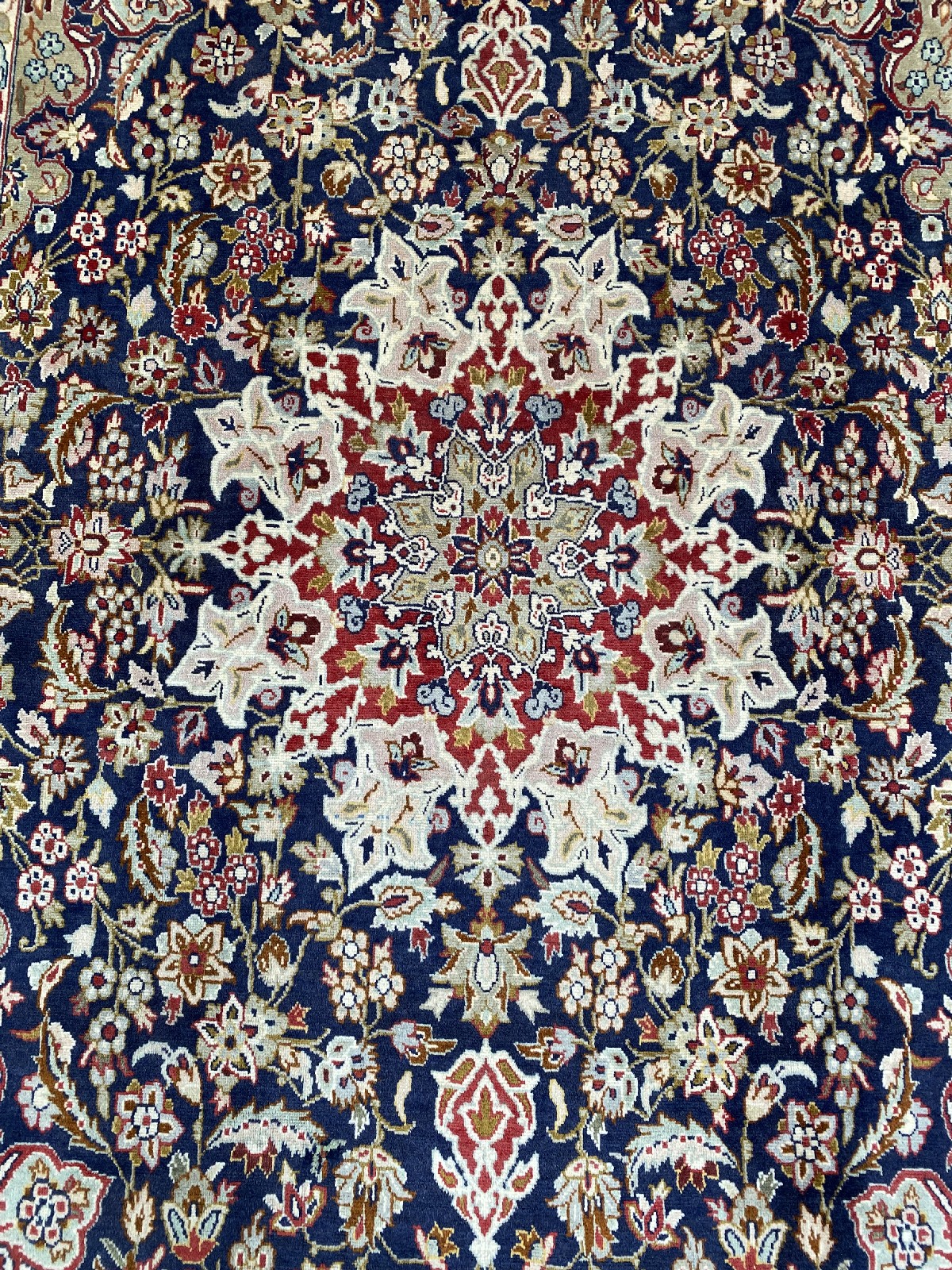 A PERSIAN ISFAHAN WOOL RUG. HANDKNOTTED UNIQUE FLORAL DESIGN OF SUNBURST MEDALLION OF PALMETTES AND QUARTERED CORNER MEDALLIONS WITHIN AN INDIGO FIELD OF SHAH ABBASSI PALMETTES, FLOWER HEADS AND SAZ LEAVES. IN SHADES OF CORNFLOWER BLUE, CREAM AND RED. BORDER OF PALMETTES, FLORAL MOTIFS TENDRILS. GALLERY EXHIBITED. IN PRISTINE CONDITION. CERTIFICATE OF AUTHENTICITY AND ORIGIN ON REQUEST. ORIGIN: IRAN (320 X 205 CM) (PLEASE NOTE THERE MAY BE SOME COLOUR VARIATION FROM PHOTOGRAPH)