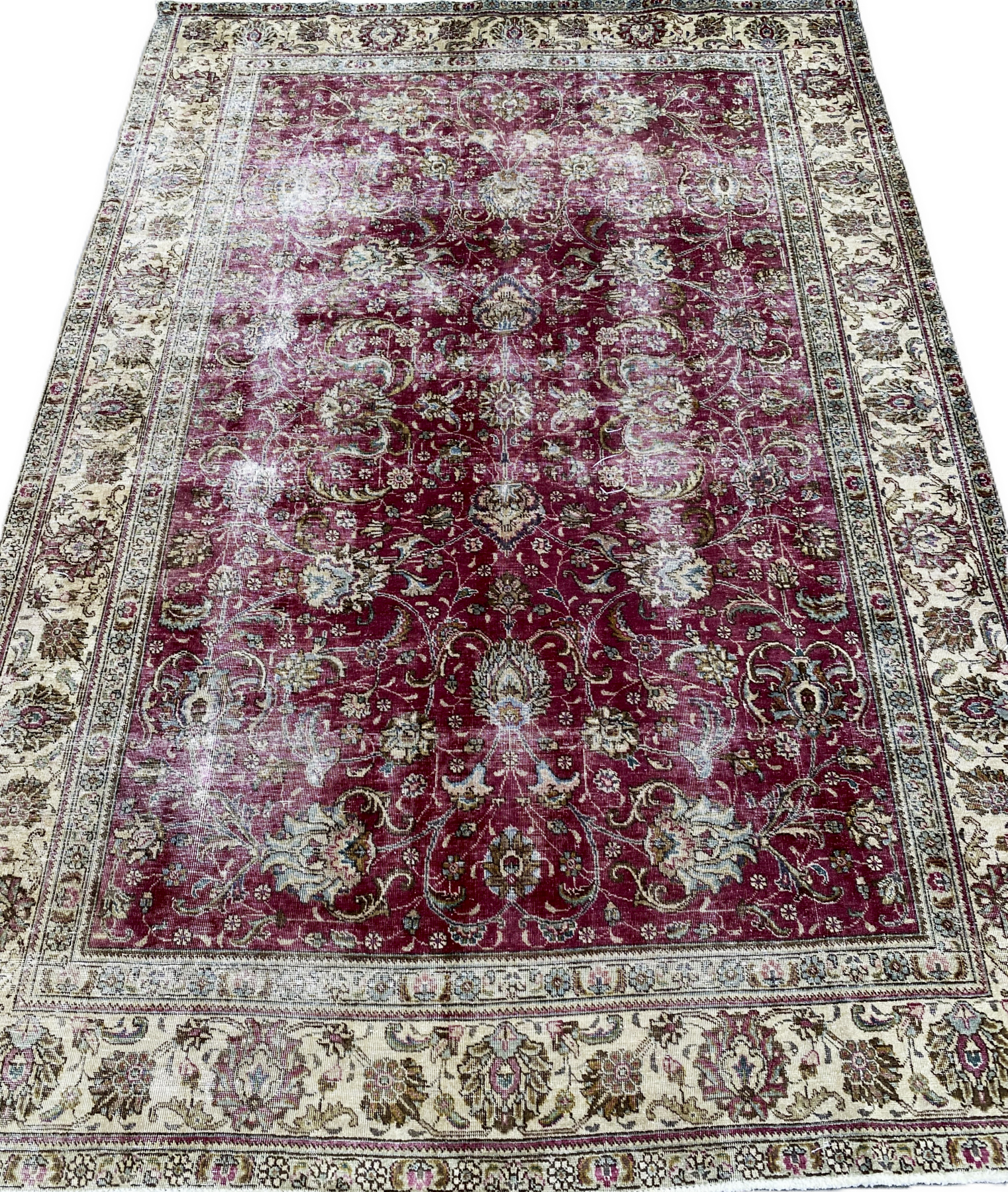AN OVER-DYED PERSIAN TABRIZ WOOL RUG. CREATED FROM AN OLD PERSIAN TABRIZ RUG WITH ALL-OVER BOLD DANCING FLOWER MOTIFS. IN SHADES OF CLARET, CREAM AND GREEN WITH CHAMPAGNE-TONED BORDER. CERTIFICATE OF AUTHENTICITY AND ORIGIN ON REQUEST. ORIGIN: IRAN (336 X 227 CM) (PLEASE NOTE THERE MAY BE SOME COLOUR VARIATION FROM PHOTOGRAPH)'