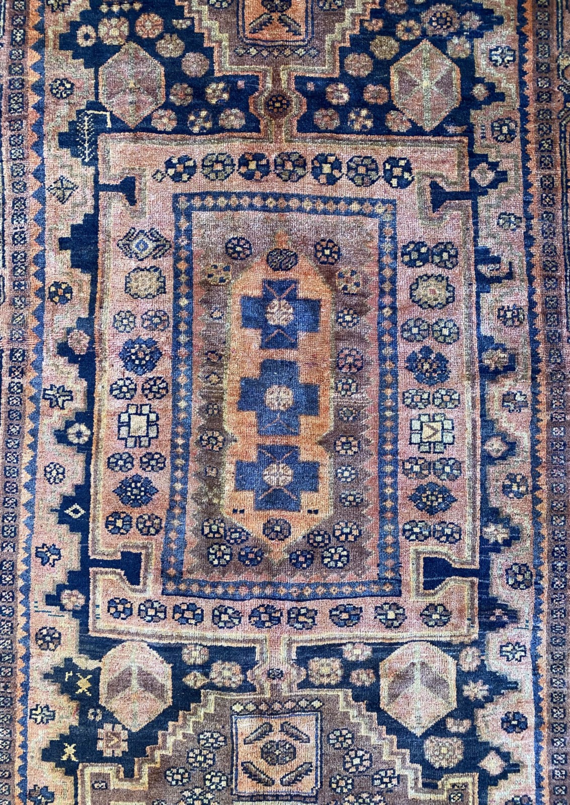 A TRIBAL KOHI WOOL RUG WITH VEGETABLE DYES. HAND-KNOTTED TRIBAL WEAVE FROM THE FARS PROVINCE WITH DESIGN OF BOLD SQUARE-SHAPED ANCHORED MEDALLION CONTAINING FLORAL MOTIFS IN A FIELD OF FLORAL PATTERNS. THE ENTIRE IN TERRACOTTA, BLUE, ORANGE AND CHARCOAL. IN GOOD CONDITION. ORIGIN: IRAN (294 X 135 CM) (PLEASE NOTE THERE MAY BE SOME COLOUR VARIATION FROM PHOTOGRAPH)